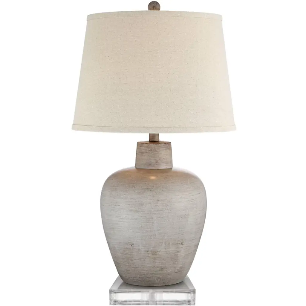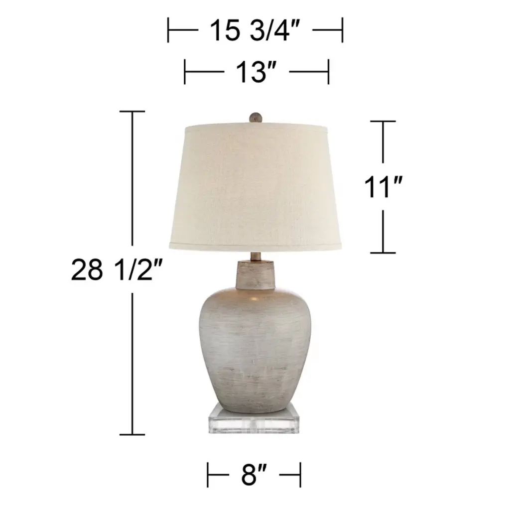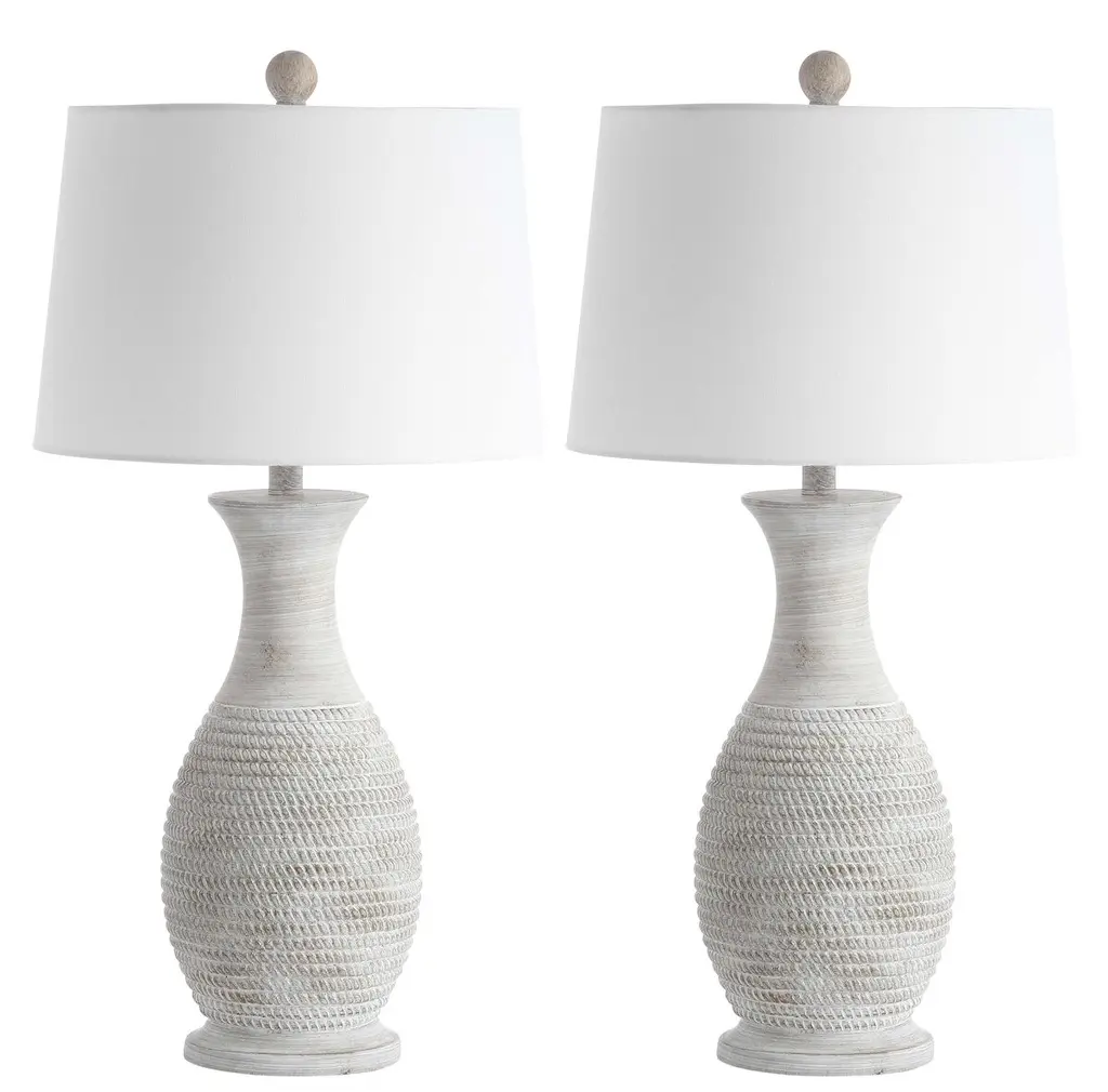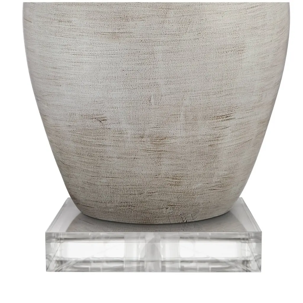 Capture the appeal of earth-inspired decor this set of two urn table lamps from Regency Hill. Each designer lamp is crafted from ceramic-look resin and given a gorgeous neutral finish, with tapered drum shades that deliver a casual classic look. Perfect for traditional, coastal, or luxe room settings. Each lamp comes with square, clear acrylic lamp riser that you can use to add extra height and dimension to the lamps.
