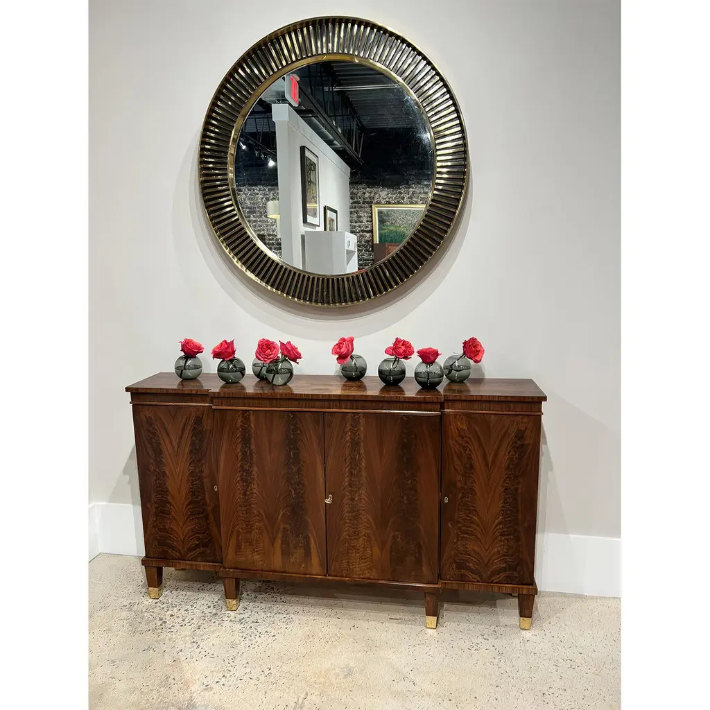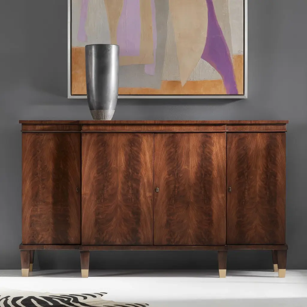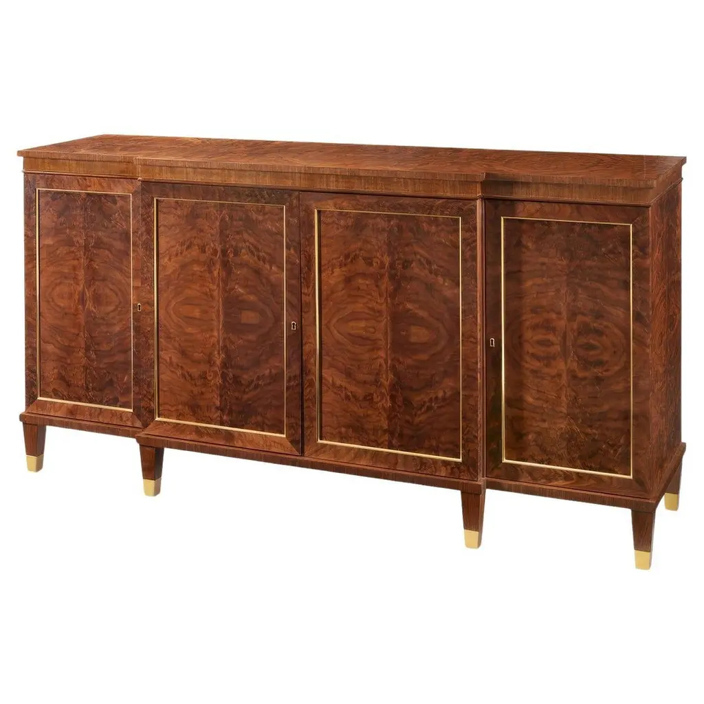 The credenza showcases the natural beauty of hand-rubbed figured walnut in a classic breakfront form. The expertly bookmatched veneer creates a classic pattern across all four doors reflecting traditional antique design elements. Polished brass feet and discreet hardware complement the walnut's rich, warm tones. The credenza offers a versatile storage solution with interior shelving behind each door. Its breakfront design not only adds architectural interest but also provides deeper storage in the center section, making it an elegant and practical addition to dining rooms, living spaces, or executive offices. Dimensions: 62" W x 12.5" D x 36.5" H