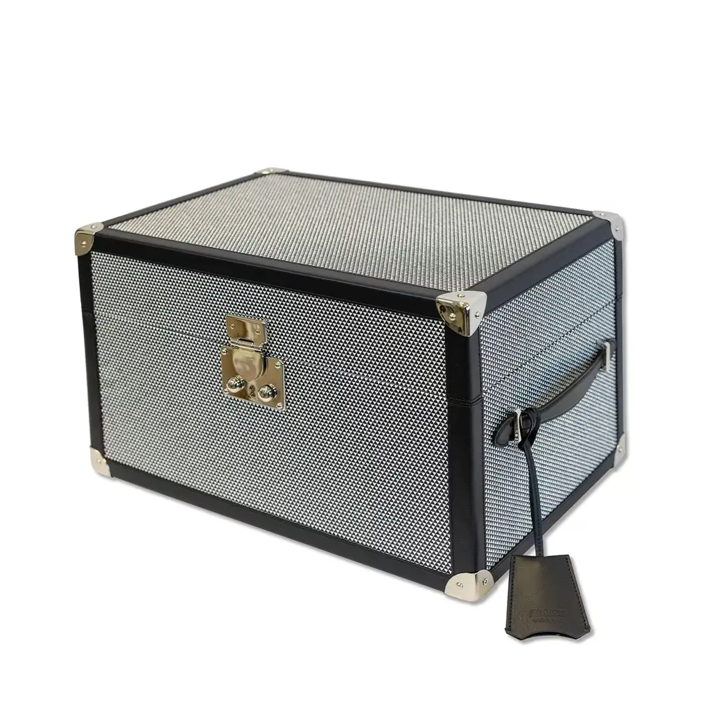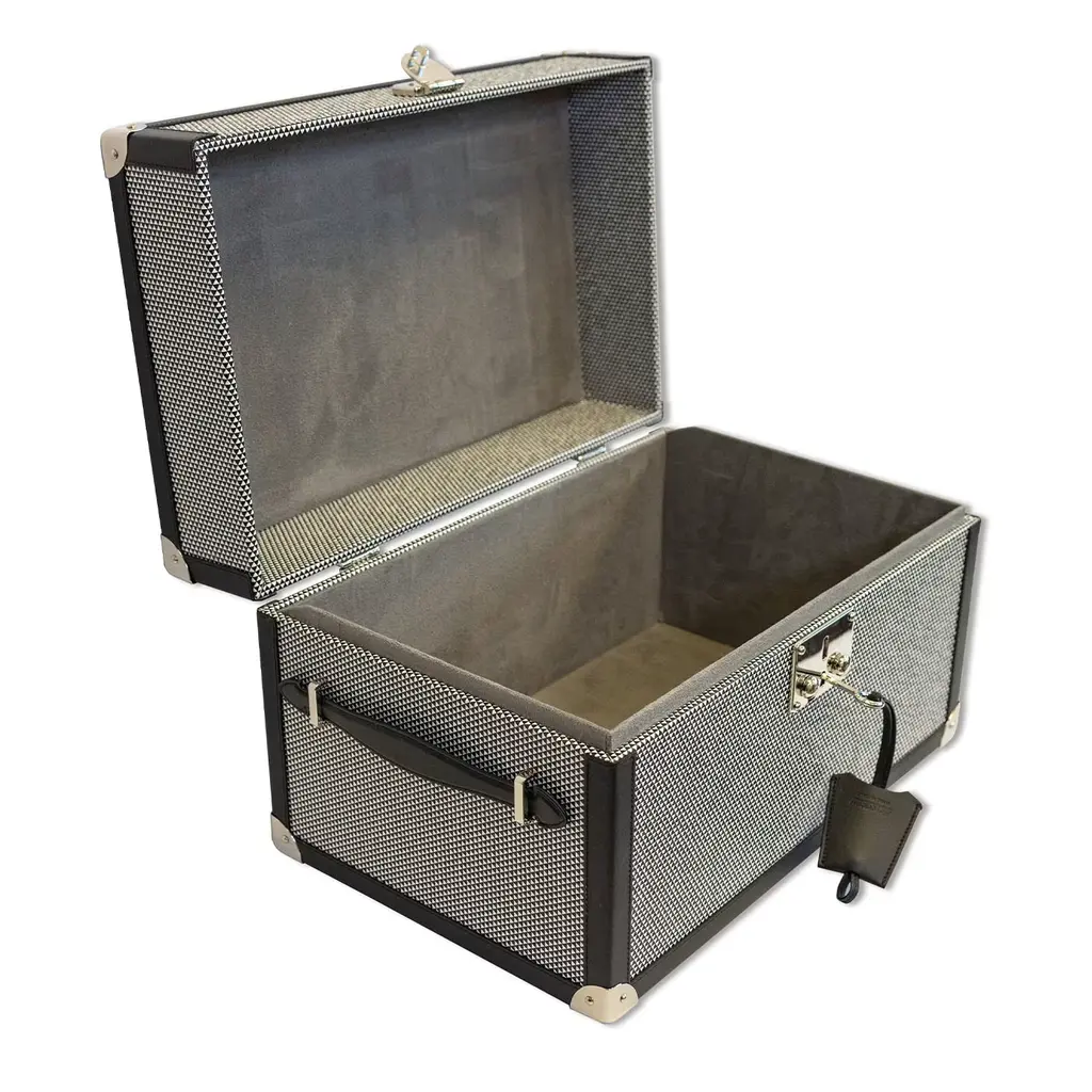 The wooden trunk is meticulously handcrafted and adorned with premium genuine leather, creating a stunning optical effect. Its interior is luxuriously lined with soft microfiber for added protection. Available in the sophisticated Optical black notte shade, as well as fourteen other colors, offering a wide range of options to suit individual tastes. Please contact the Concierge for more information.