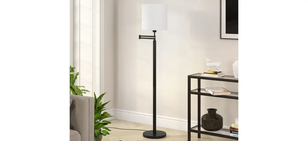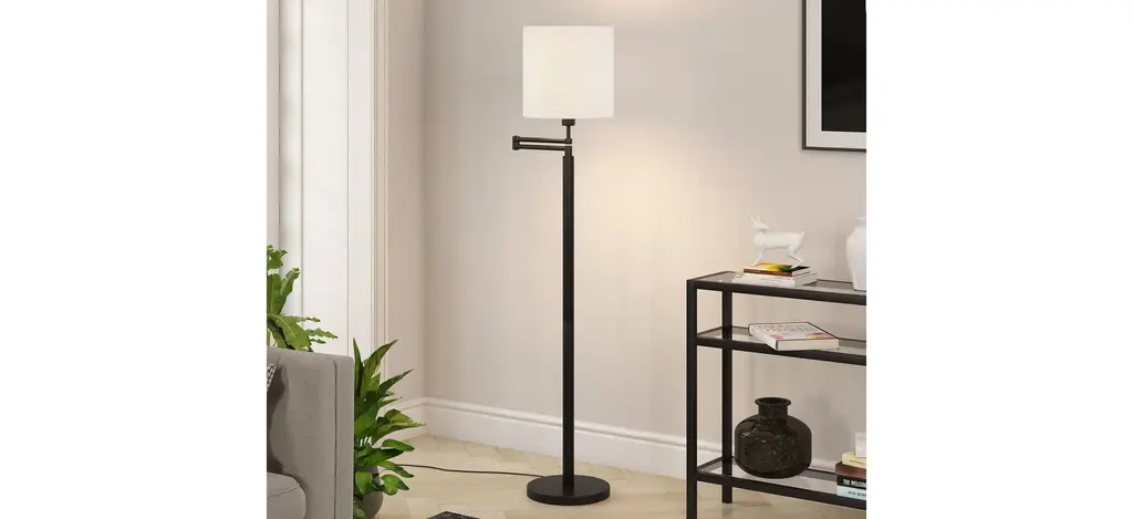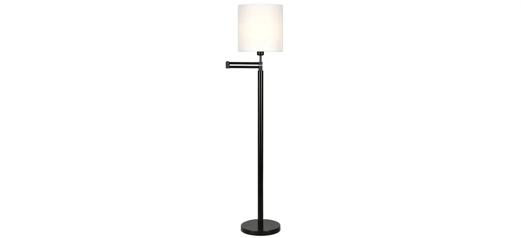 Combining contemporary feel with modern streamlined design, this 62" floor lamp is the perfect addition to your living room or bedroom ensemble. This lamp features a swing arm that allows easy movement of light across different areas of the room. Finished in a blackened bronze metal with a fabric round shaped shade. Handcrafted in a blackened bronze metal. Featuring a round shaped shade.