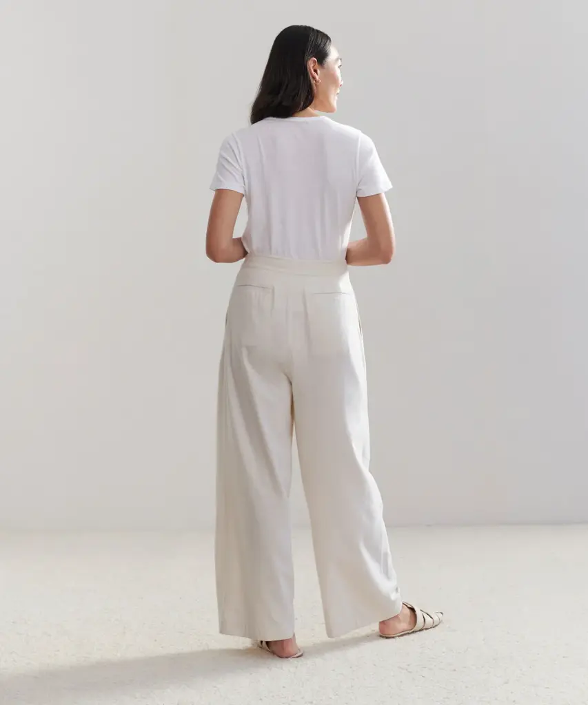 Relaxed Trouser Ivory Made from 100% textural raw silk for an effortless look that's equally polished and comfortable. With tailored pleats that seamlessly transition into a wide-leg silhouette, the Relaxed Trouser is the definition of California cool. Pair it with a classic cami or tee or embrace an oversized aesthetic from head-to-toe with your favorite lightweight knit.