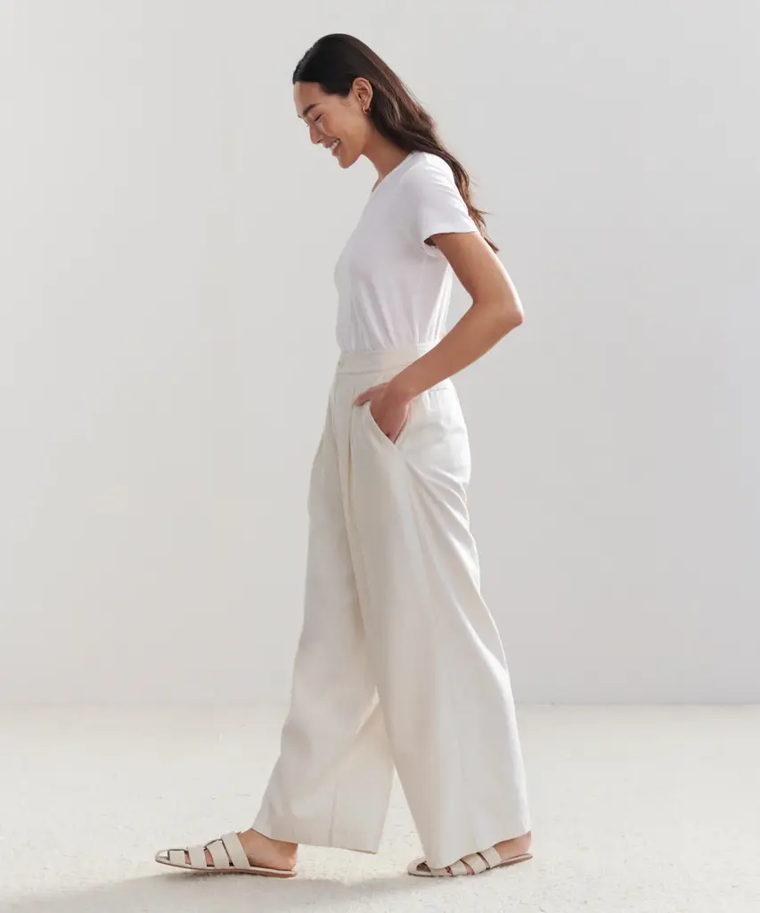 Relaxed Trouser Ivory Made from 100% textural raw silk for an effortless look that's equally polished and comfortable. With tailored pleats that seamlessly transition into a wide-leg silhouette, the Relaxed Trouser is the definition of California cool. Pair it with a classic cami or tee or embrace an oversized aesthetic from head-to-toe with your favorite lightweight knit.