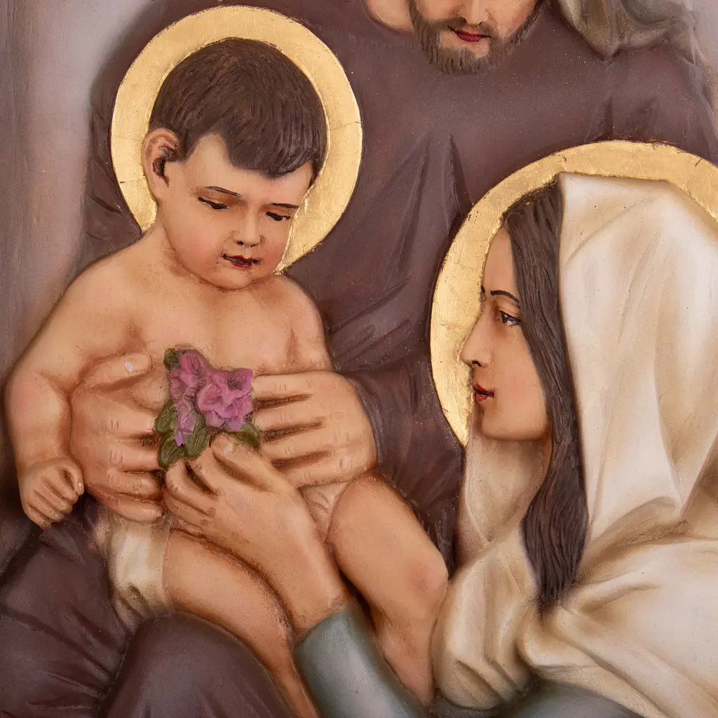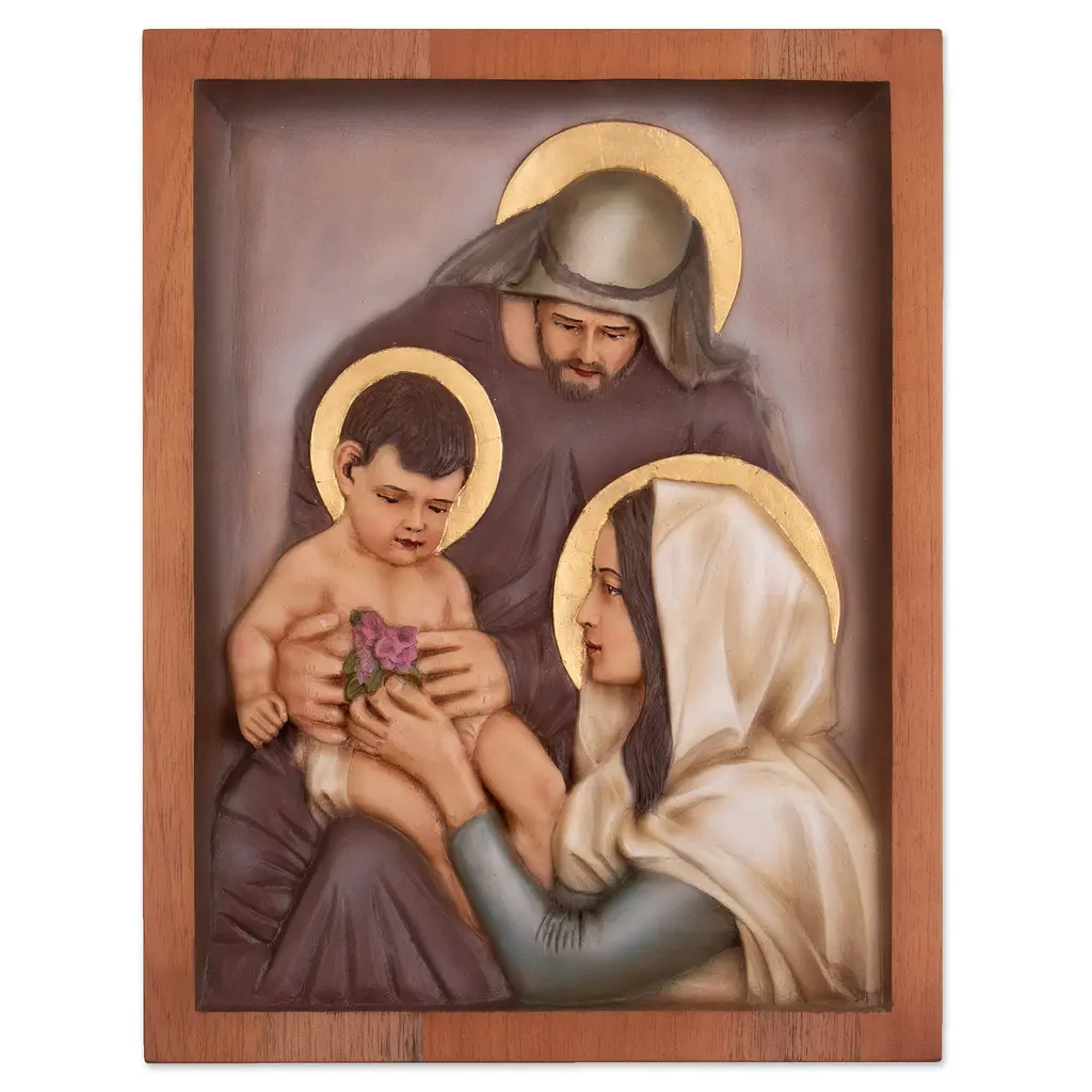 Religious Hand-Carved Cedarwood Holy Family Relief Panel- Flower Of The Holy Family