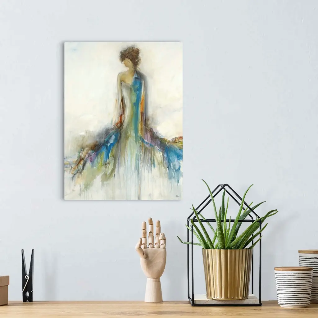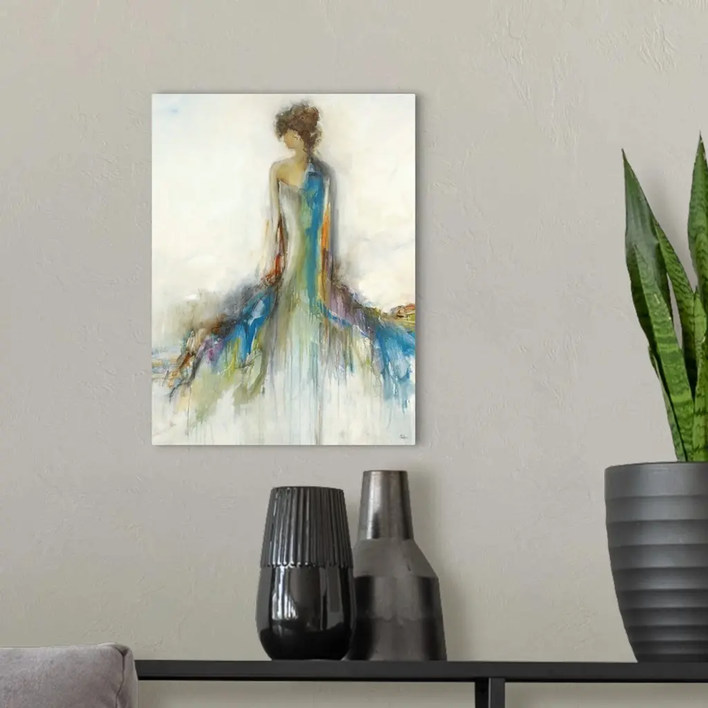Abstract portrait of the back of a woman with a long, colorful, flowing dress with the hues dripping to the bottom of the canvas.