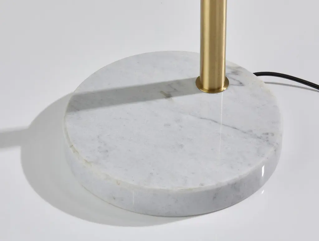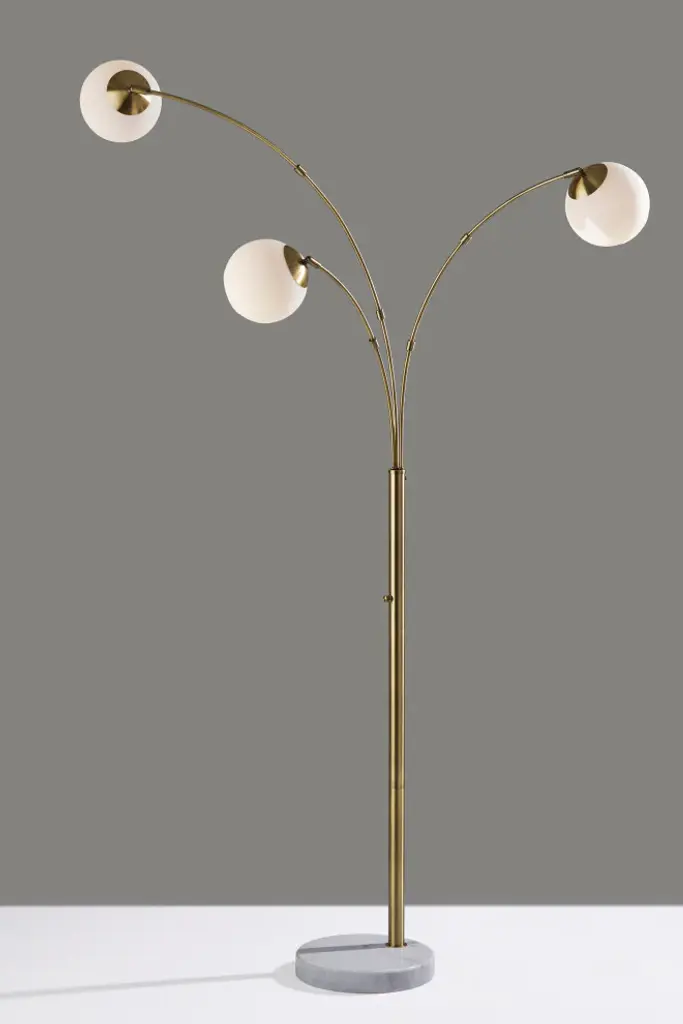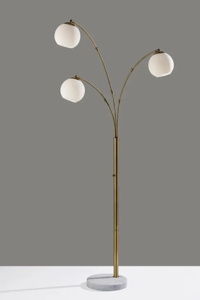 Inspired by mid-century design, the Remi Arc Lamp will update your style with a hint of classic elegance. Mixed materials create a high end decorative look that is both functional and stylish. An warm antique brass metal finish is paired with a white mable base and three white opal glass globe shades. A rotary switch located on the pole controls the light at 4 settings: 1 light on, 2 lights on, 3 lights on, off. This allows for multiple brightness settings to satisfy all lighting needs. ETL TestedDry RatedUses: 3 x 40W Type A (not included)4-Way: 1 light on, 2 lights on, 3 lights on, off Rotary Switch on Tube