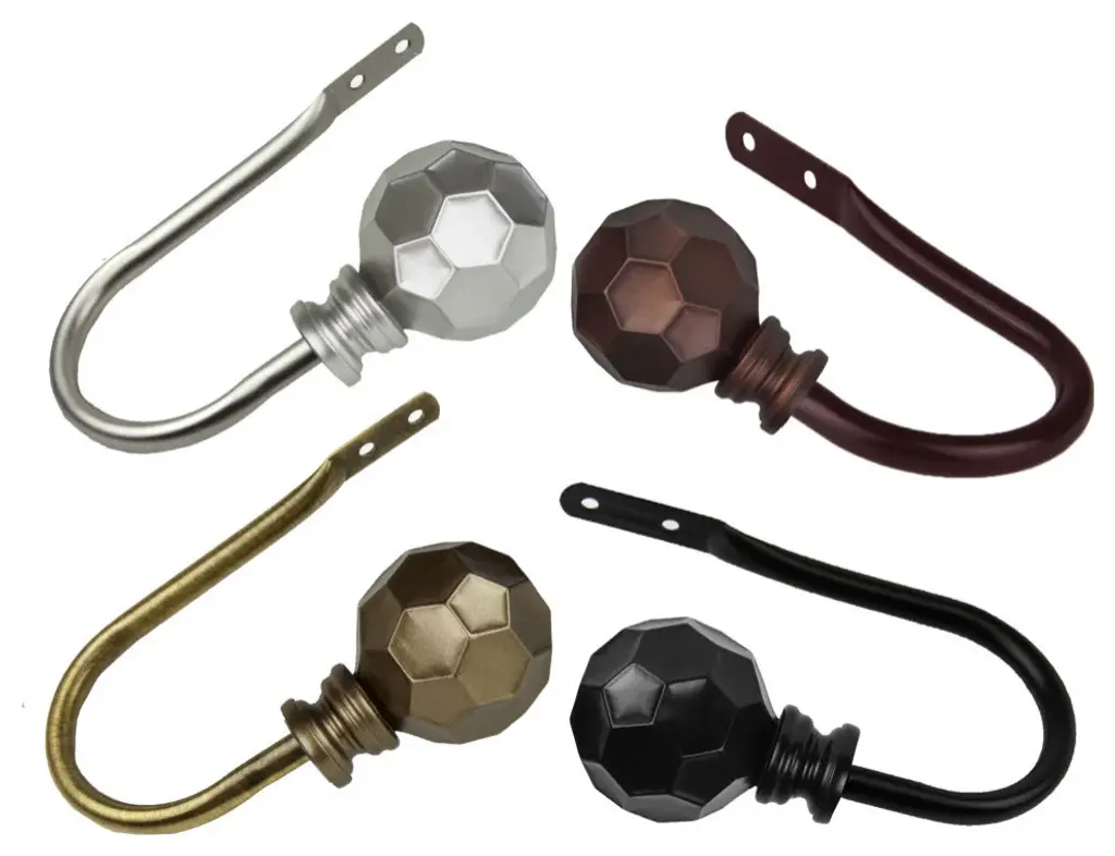 Finish off the look of your window hardware with matching holdback sets. High quality steel J hooks and Resin finials. Perfect for tying back curtains to the side when draperies are open.Includes 2 J Hooks, Finials, and Mounting Hardware.Projection: 3"Finial measurement: 3" W x 2.25" H x 2.25" D