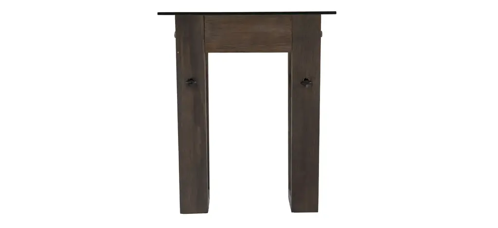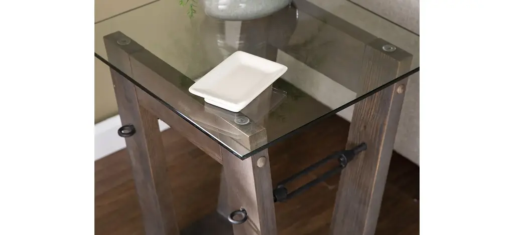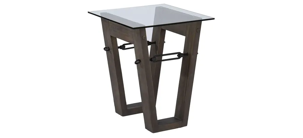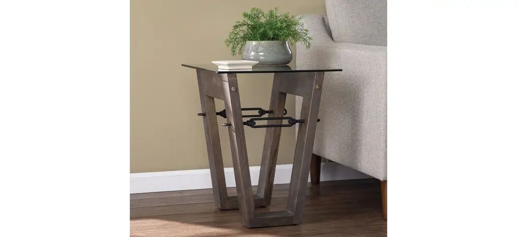 Remi Reclaimed Wood End Table add authenticity to your home design with this reclaimed wood side table. Iron accents give your living space an industrial feel, while the spacious glass tabletop easily holds a table lamp and your favorite book. Place this square accent table in your entryway to hold your keys or a potted plant or slide alongside your living room sofa as a convenient side table. Enjoy a rustic, reclaimed look when you bring home this glass-top end table.