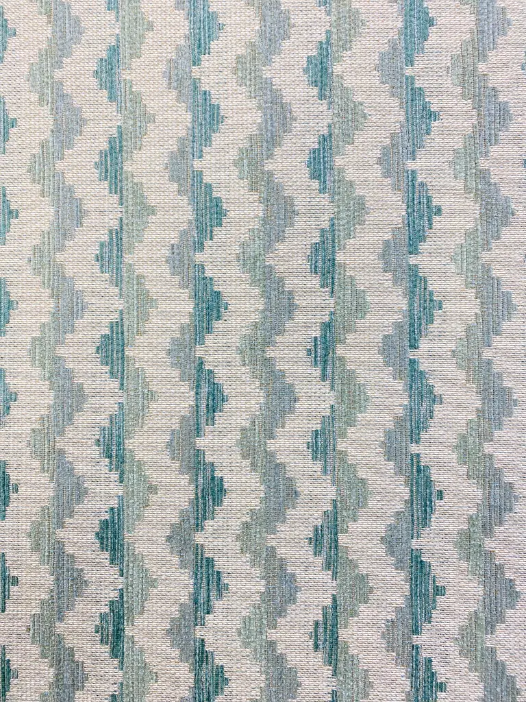 56”wide Schumacher Roebuck Performance indoor outdoor geometric water & stain resistant upholstery fabric in mineral aqua seafoam green. Here is what Schumacher says about this fabric: This woven stripe combines performance-grade durability with an ultra-soft hand and incredible tonality, making it ideal for all kinds of upholstery. Item Width 56” Horizontal Repeat 2 1/4" (6Cm) Vertical Repeat 4 3/4" (12Cm) Content 45% Acrylic, 45% Polyester, 10% Cotton Abrasion Martindale 25,000 Match Straight Country of Origin Turkey Price is per yard.