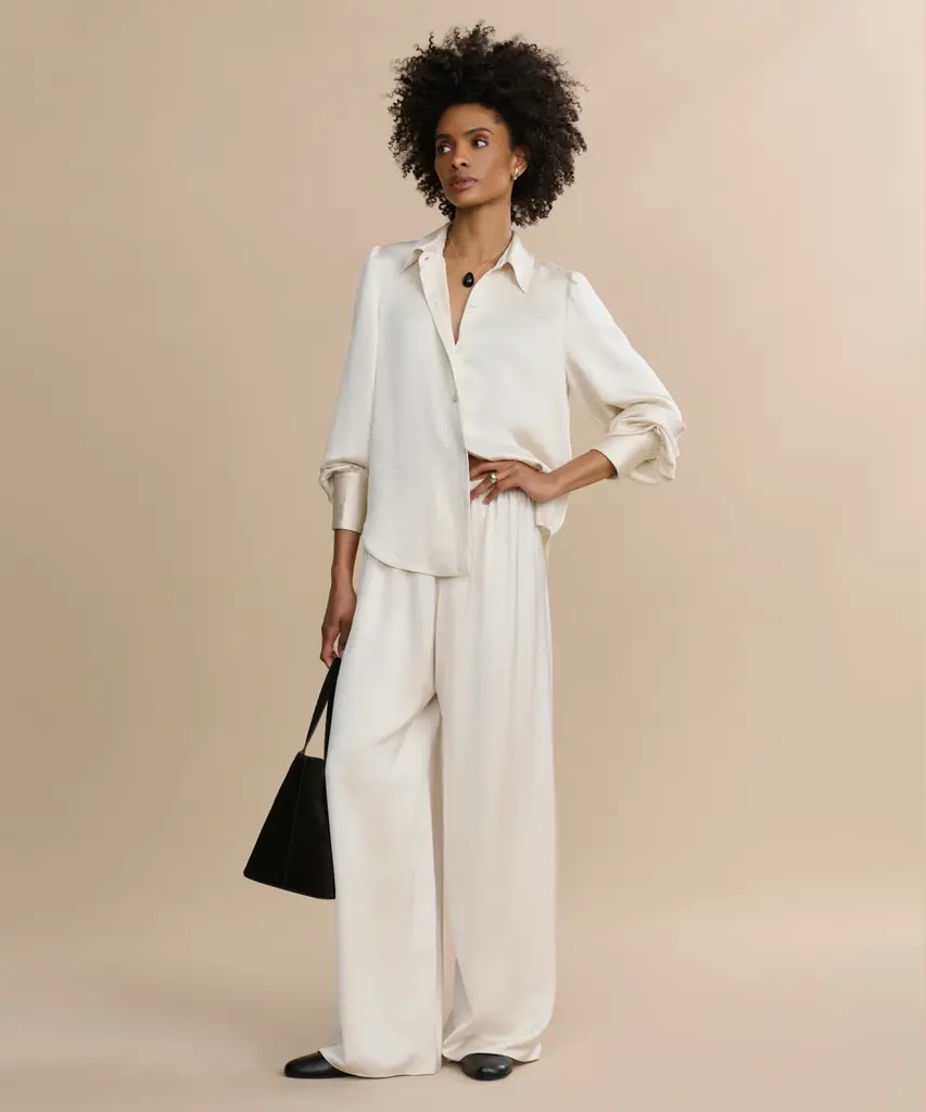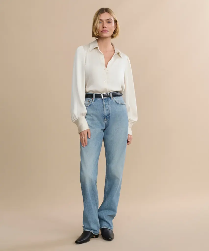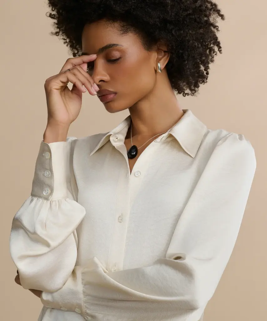 Remy Shirt Ivory An elevated, everyday blouse with just the right amount of polish. Cut from vintage inspired satin, the Remy features puffed sleeves and soft gathers at the back for added femininity.