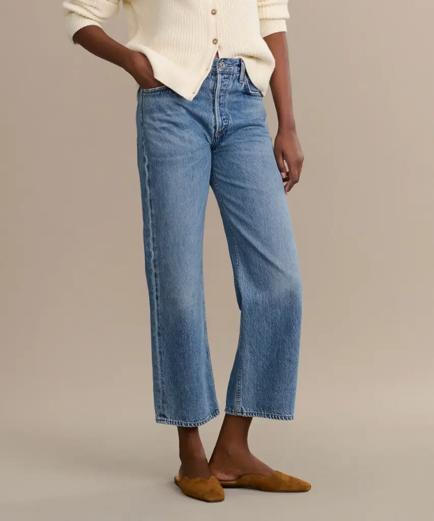 Ren jean Shrine A high-rise jean with a cropped, wide-leg silhouette that strikes the perfect balance between relaxed and flattering. Part of AGOLDE’s Weightless Collection, this pair is made from regenerative cotton for all-day comfort. An easy choice for everyday—just add a half-tucked tee for an effortless look. Please note that this item is not eligible for promotions.