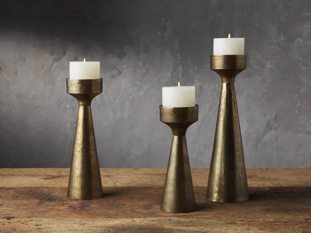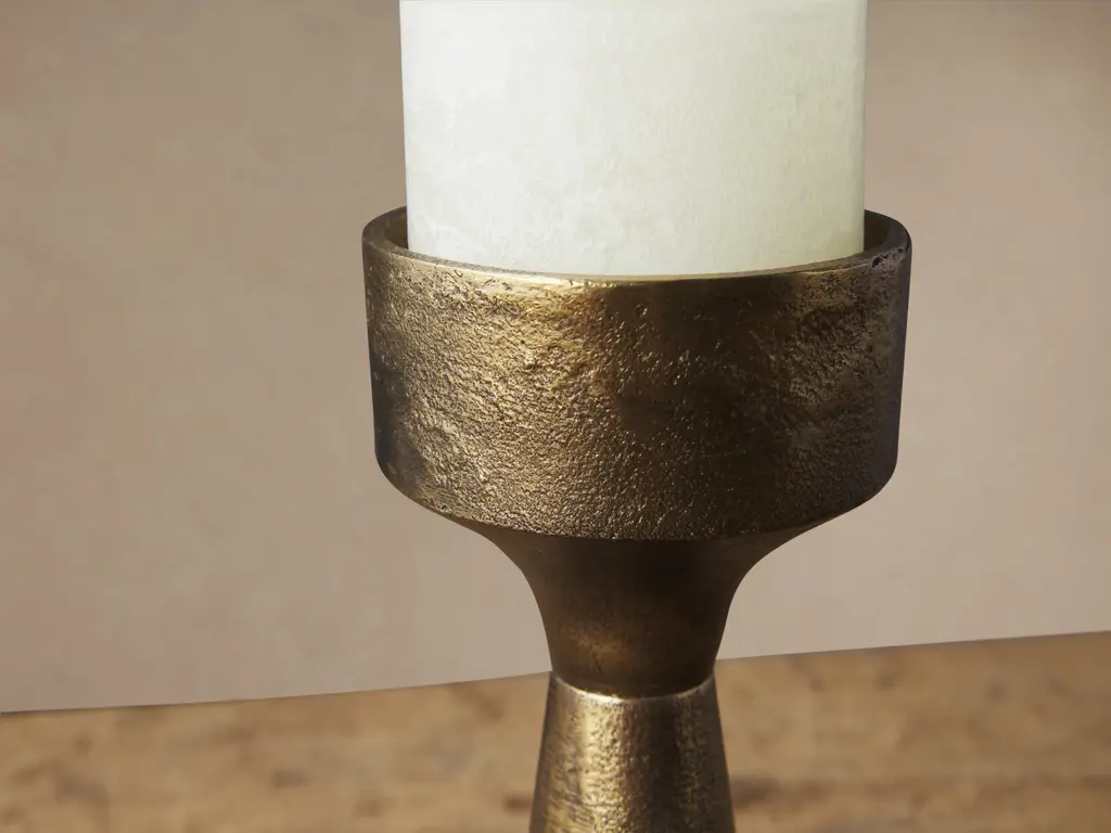 Add rustic warmth to your décor—our Ren Pillar Holders are cast from aluminum and finished with a warm, Bronze tone to subtly accentuate your space. Pillar candle holder cast from aluminum. Accommodates our 3.25" pillar candles. Features a Bronze finish.
