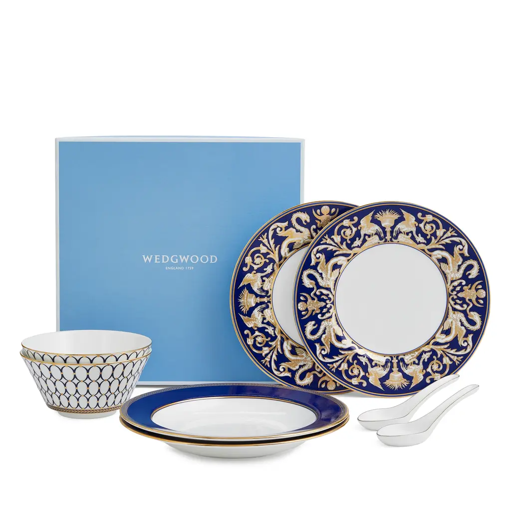 Embellished with intricate garlands, oval links and a fanciful dragon motif, this Wedgwood dinnerware evokes Europe's glorious Renaissance period. Rendered in deep blue and gold to transform any formal meal into a spectacular royal gala.