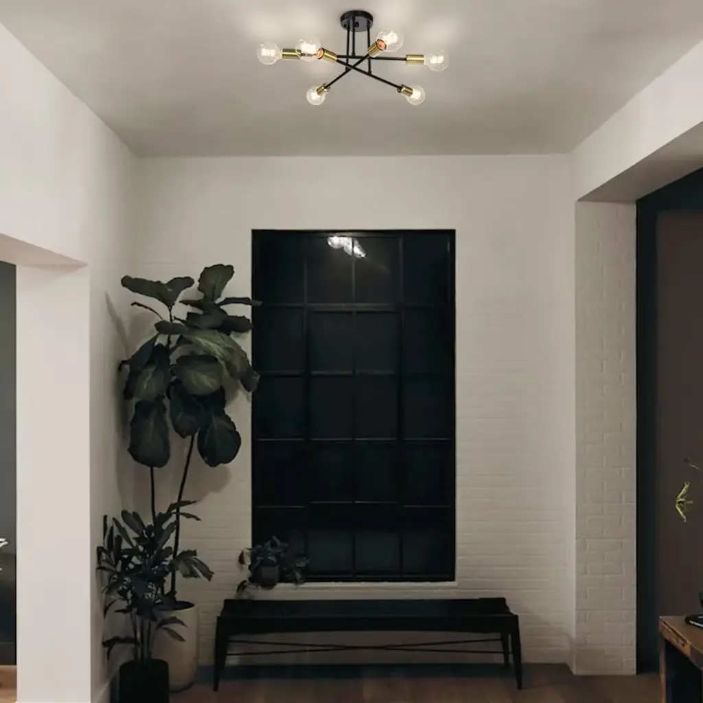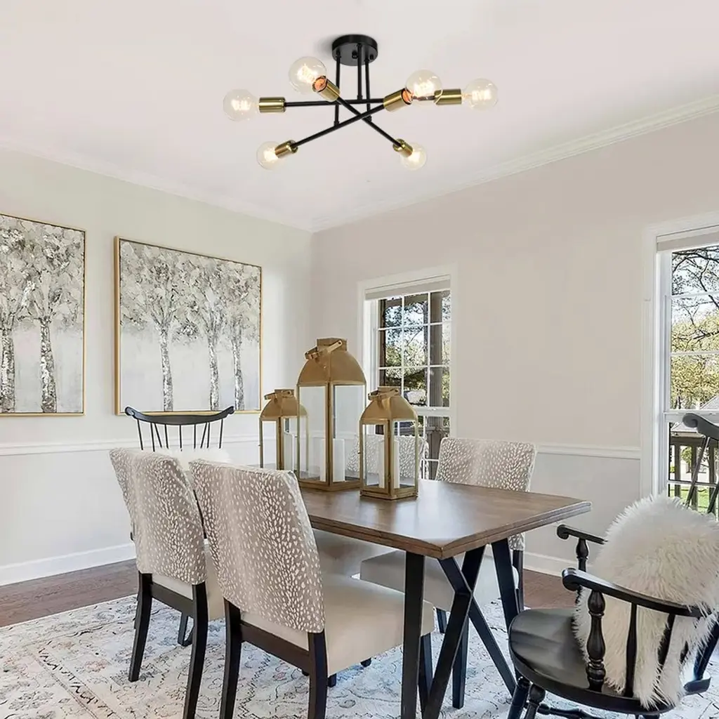 Illuminate your space with this stylish 6-light flush mount chandelier featuring a sleek linear design. Inspired by Mid-Century Modern aesthetics, this chandelier effortlessly blends simplicity with elegance. Its dimmable feature allows you to adjust the lighting to your needs, while the easy installation makes it a convenient addition to any room. With a size of 18", this piece fits perfectly in smaller spaces, adding a touch of sophistication. The E26 bulb compatibility (bulbs not included) ensures versatility. Ideal for those who appreciate clean, geometric lines and contemporary design, this piece will enhance your home with a modern, timeless look.