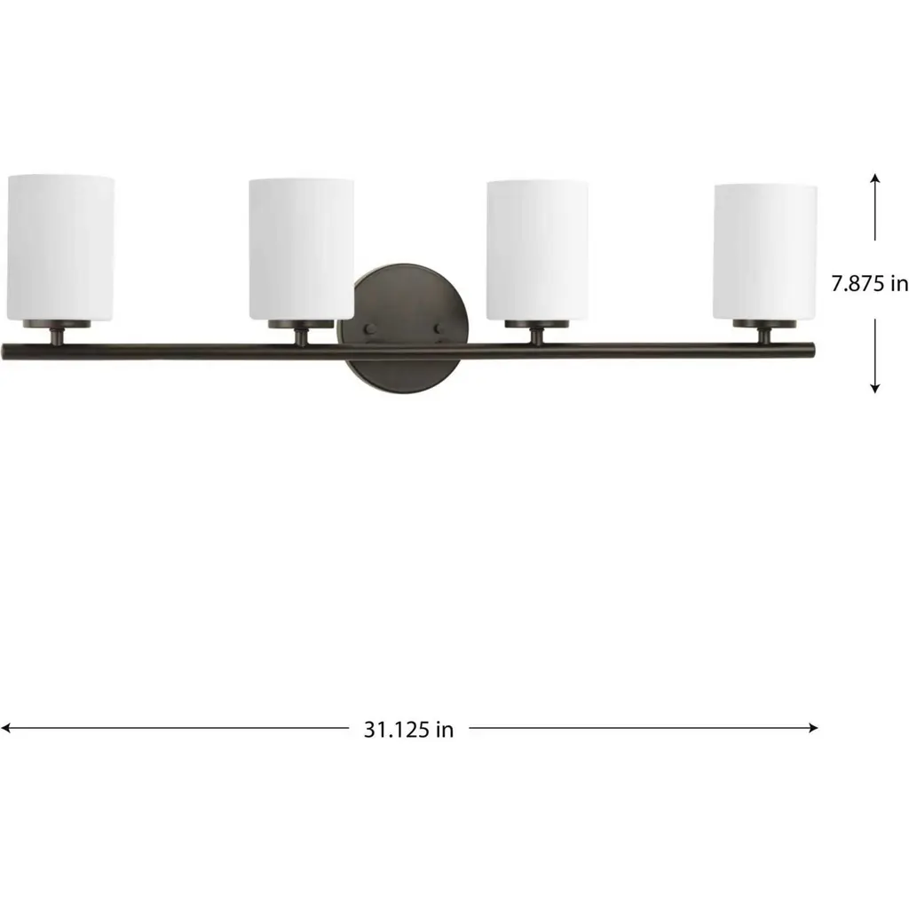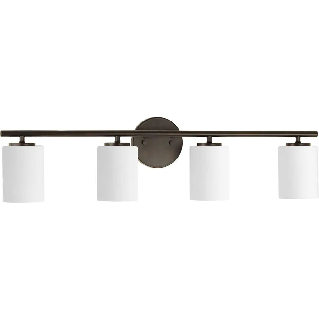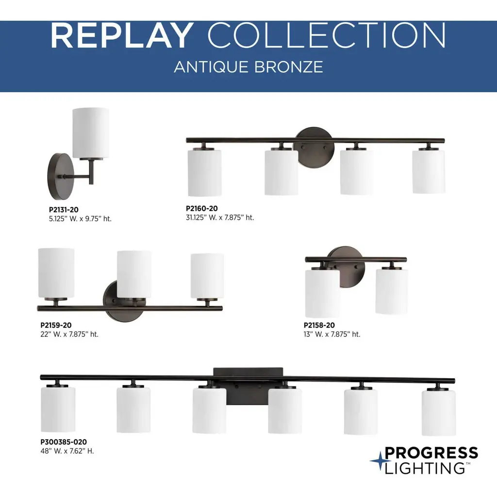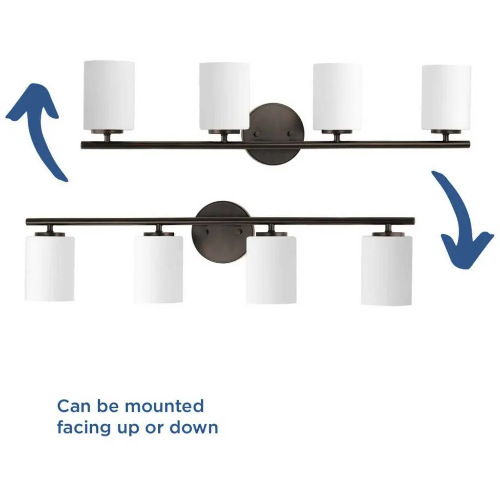 Four-light bath & vanity from the Replay Collection, smooth forms, linear details and a pleasingly elegant frame enhance a simplified modern look. Fixture can be mounted up or down. Antique Bronze finish.