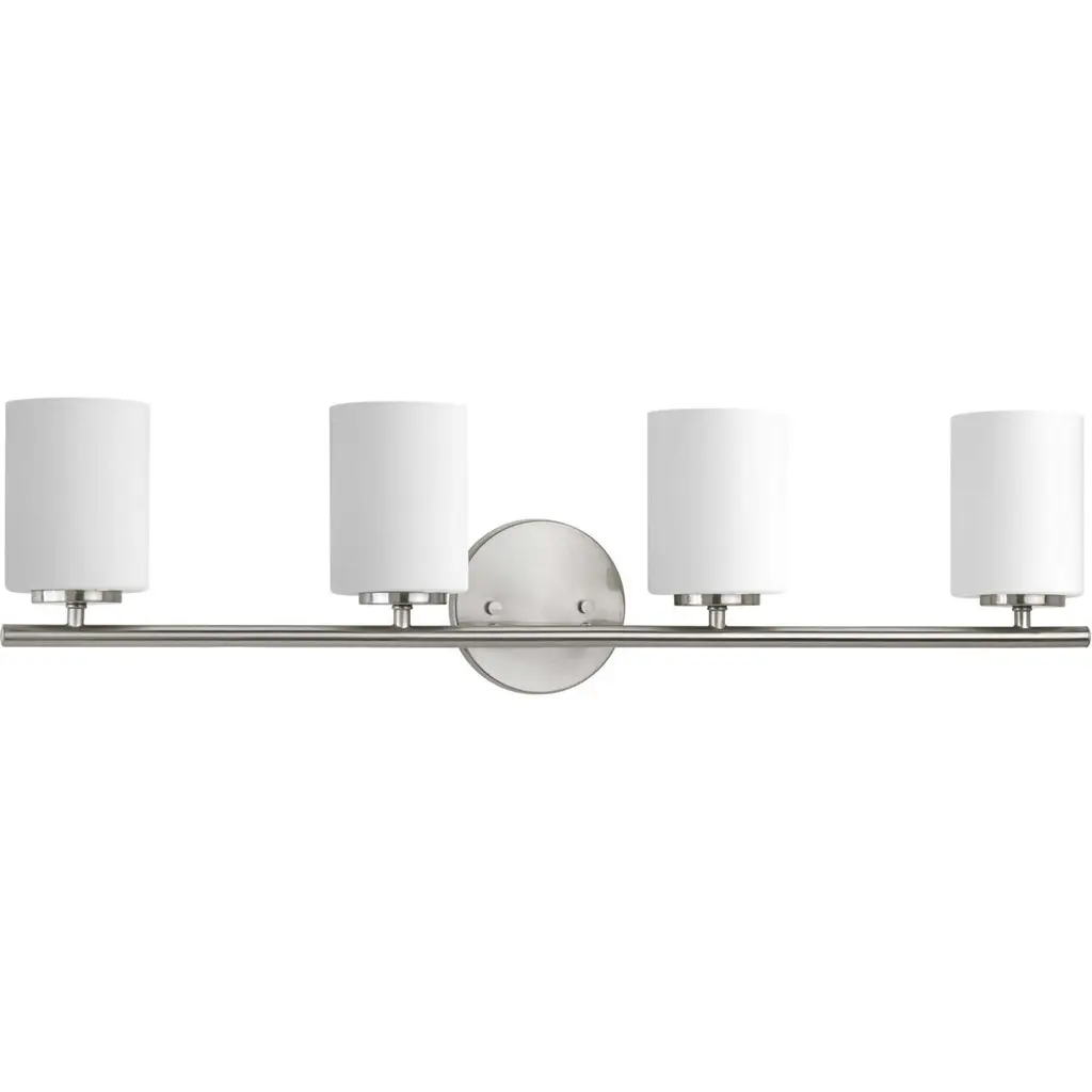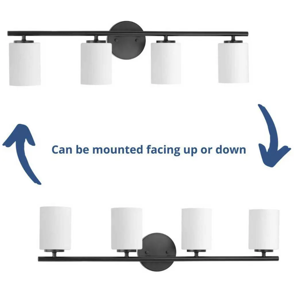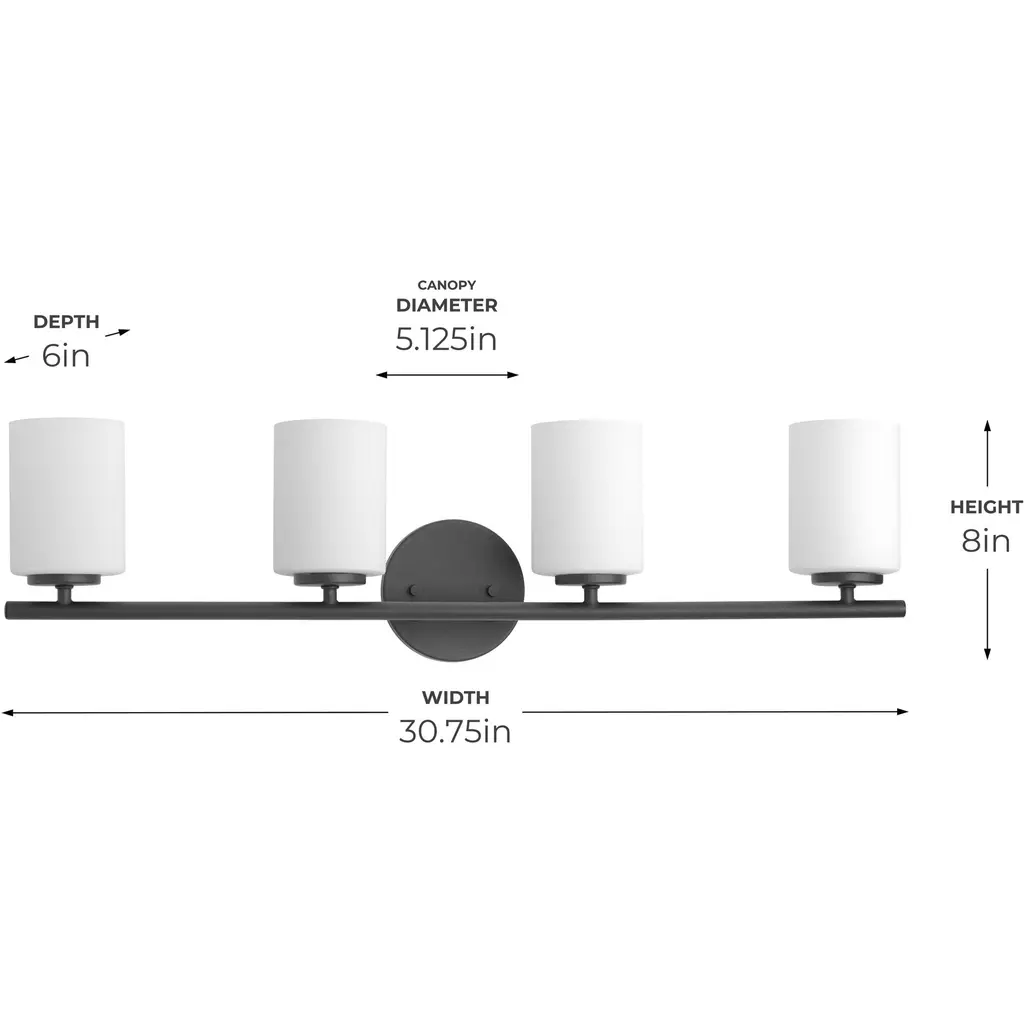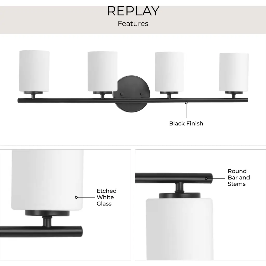 Four-light bath & vanity from the Replay Collection is highlighted by a clean, linear form paired with etched white glass. A pleasingly elegant frame enhances a simplified modern look within the Replay collection. Black finish.