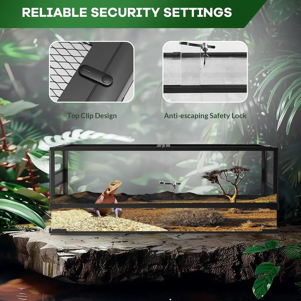 ANTI-ESCAPE DESIGN: The 4 safety clasps on the lid ensure that the terrarium tank closes tightly, preventing your reptile amphibian chameleon pet from escaping. The security lock prevents your child from accidentally opening the door of the tank, ensuring your child's safety. FREEDOM TO CHANGE BOTH ENVIRONMENTS: A 3.5inch water-tight base allows this reptile tank to be used as either a desert terrarium or a rainforest terrarium. The screen mesh on both sides can also be replaced with glass to provide a warmer environment for your pet. TEMPERED GLASS TANK: This reptile terrarium is made of high quality 4.8mm tempered glass. Durable and with good light transmission, you can observe and interact with your pets easily. Make this tank a bright spot in your home! TOP SCREEN VENTILATION: The wire top screen provides ventilation, allowing UV and infrared rays to penetrate, as well as making it easy for you to clean and feed. The top screen has pre-drilled wire entry holes for easy organization of wires and tubes. QUICK 5-MINUTE INSTALLATION: This tank is so easy to install that one person can set it up or take it down in less than 5 minutes. Just follow the steps in the instructions you will soon be able to set up the perfect glass terrarium for your beloved pet.