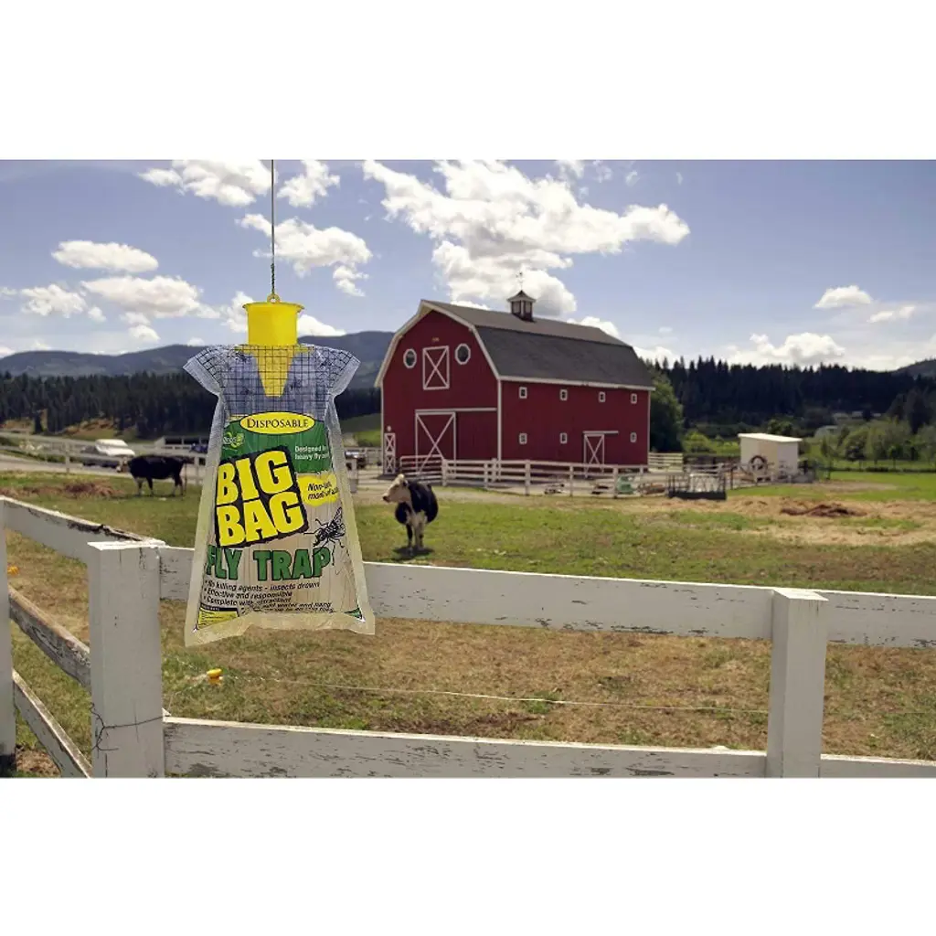 (24 TRAPS) This trap is baited for fly species which are most common in agricultural areas -- including house flies, false stable flies, blow flies, blue and green bottle flies, flesh flies, face flies and many others. The RESCUE! Big Bag Fly Trap contains a fast-acting fly attractant that starts working as soon as you add water. Food and feed additives are combined with other dried ingredients to make the RESCUE! attractant. Lured by the scent, flies enter through the yellow top cap and drown in the water. Unique features and benefits: Designed to handle areas with heavy fly concentrations, powder attractant is contained within the trap itself, attractant dissolves and activates quickly when water is added to the bag, trap's design eliminates touching the bait or the flies, completely disposable, holds up to 40,000 flies. Once lured inside the trap, the flies cannot escape and drown in the water added to the bag. Banned in GU,VI