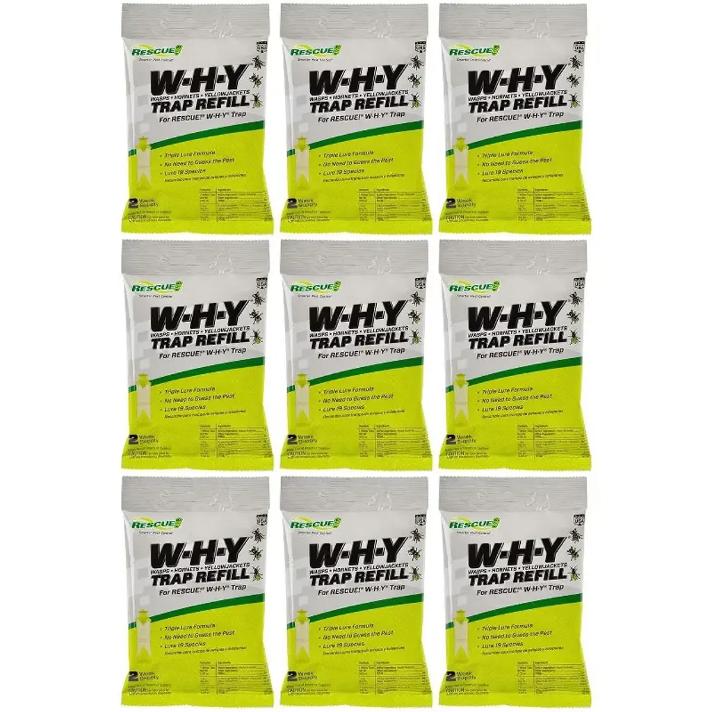 WHY Trap Attractant Refill � 2 Week Supply The RESCUE! W�H�Y Attractant Kit works inside the W�H�Y Trap for Wasps, Hornets & Yellowjackets to lure nearly twenty species of stinging insects. The two-week supply includes three attractants that work together inside the trap. Wasps, hornets and yellowjackets enter through either the top or bottom holes and get trapped. Unique Features: non-toxic mode of action; lures queens in early spring before they build nests; lures foraging workers from late spring through summer and fall; 2-week supply; no killing agents � insects die naturally; will not lure beneficial honeybees.