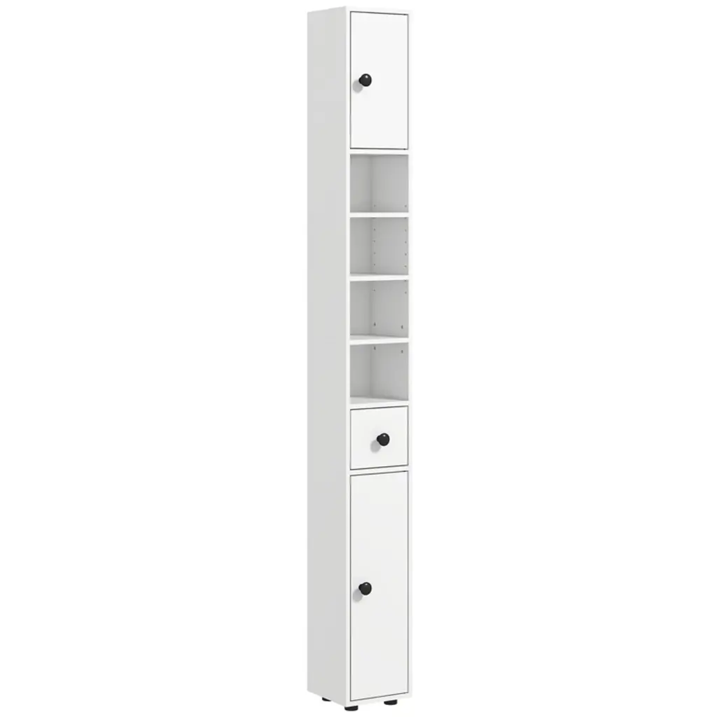 Do you need more storage space in your bathroom? Of course you do. This toilet roll holder with a shelf from kleankin gives you that extra boost you need. This bathroom cabinet fits into those tight corner spaces that otherwise get left empty. Use that extra space to store daily hygiene products, cleaning supplies, or towels. Don't be stuck putting everything in the hallway wardrobe; keep what you need close by when you need it with the kleankin bathroom floor cabinet. Features: - Four open shelves and two 2-tier cabinets neatly arrange your towels, linen, and other bathroom essentials - The shelves inside the cabinets are 3-level adjustable for flexible storage - Quality steel hinges allow smooth opening and closing of the doors - The melamine surface can prevent water damage - An anti-tipping design is included for added safety - Non-slip pads at the bottom protect your floor from scratches. - Assembly required Specification: - Color: White - Materials: Particle Board - Overall Dimensions: 7.75" W x 7.75" D x 70.75" H - Top Shelf Size: 7" W x 7" D x 6" H (Each Tier) - Bottom Shelf Size: 7" W x 7" D x 8.75" H - Top Cabinet Inner: 7" W x 6.25" D x 6.75" H (Each Tier) - Bottom Cabinet Inner: 7" W x 6.75" D x 9.5" H (Each Tier) - Drawer Inner Size: 5.75" W x 6" D x 5.5" H - Weight Capacity: 66 lbs. (Total), 11 lbs. (Shelf) - Item Label: 834-625V80WT Package Includes: - 1 x Bathroom Cabinet - 1 x Manual Resenkos Toilet Storage Cabinet, Bathroom Storage Cabinet,71" Small Bathroom Storage Cabinet with Open Shelves, 2 Cabinets, Adjustable Shelves, White