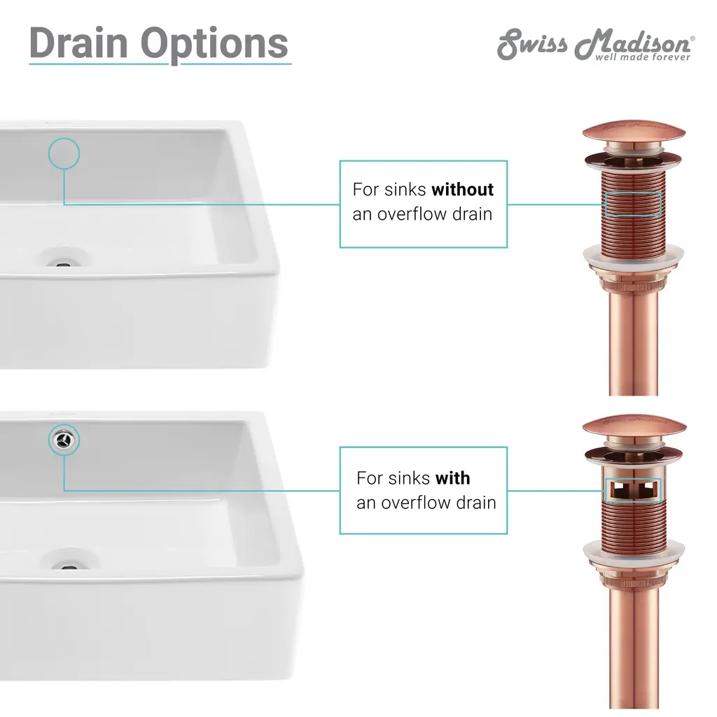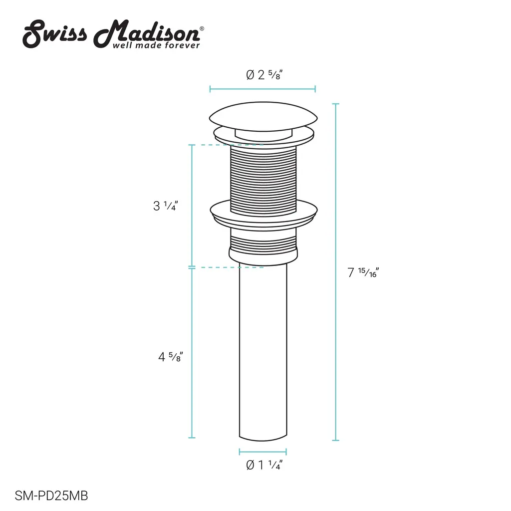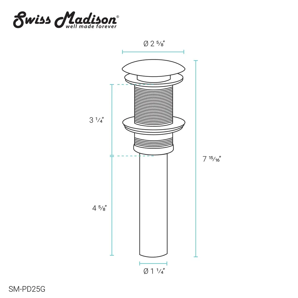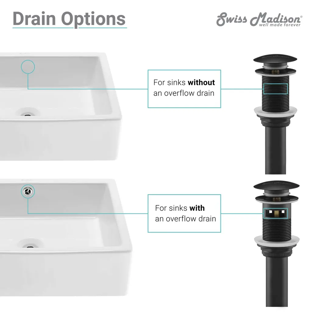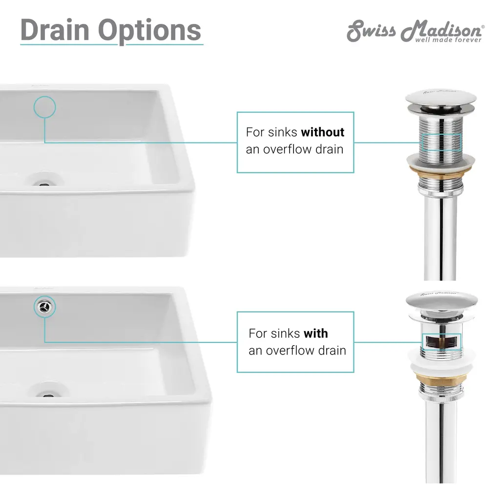 A modern and sleek drain for Swiss Madison brand sinks. Our pop-up drain adds sophistication and convenient operation to any bathroom sink. Simply pressing the drain allows it to open and close.Features:
