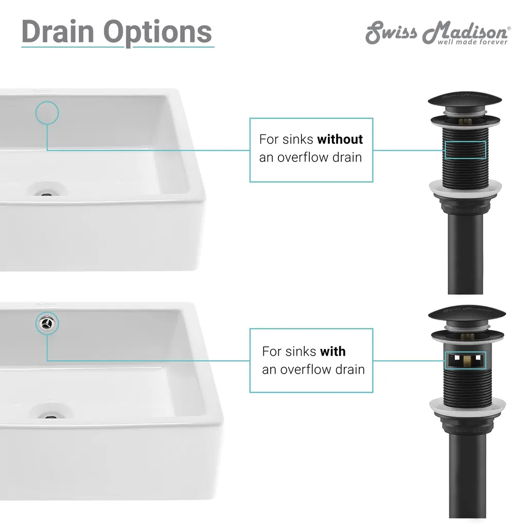 A modern and sleek drain for Swiss Madison brand sinks. Our pop-up drain adds sophistication and convenient operation to any bathroom sink. Simply pressing the drain allows it to open and close.Features: