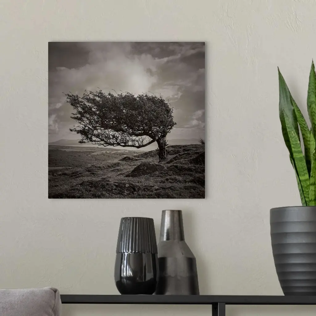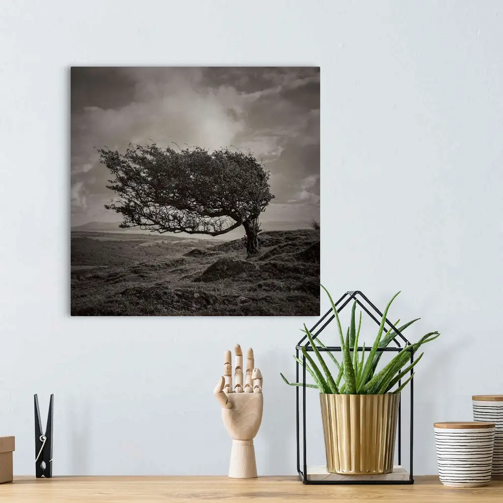 A black and white photograph of a tree standing lone in an ethereal landscape.