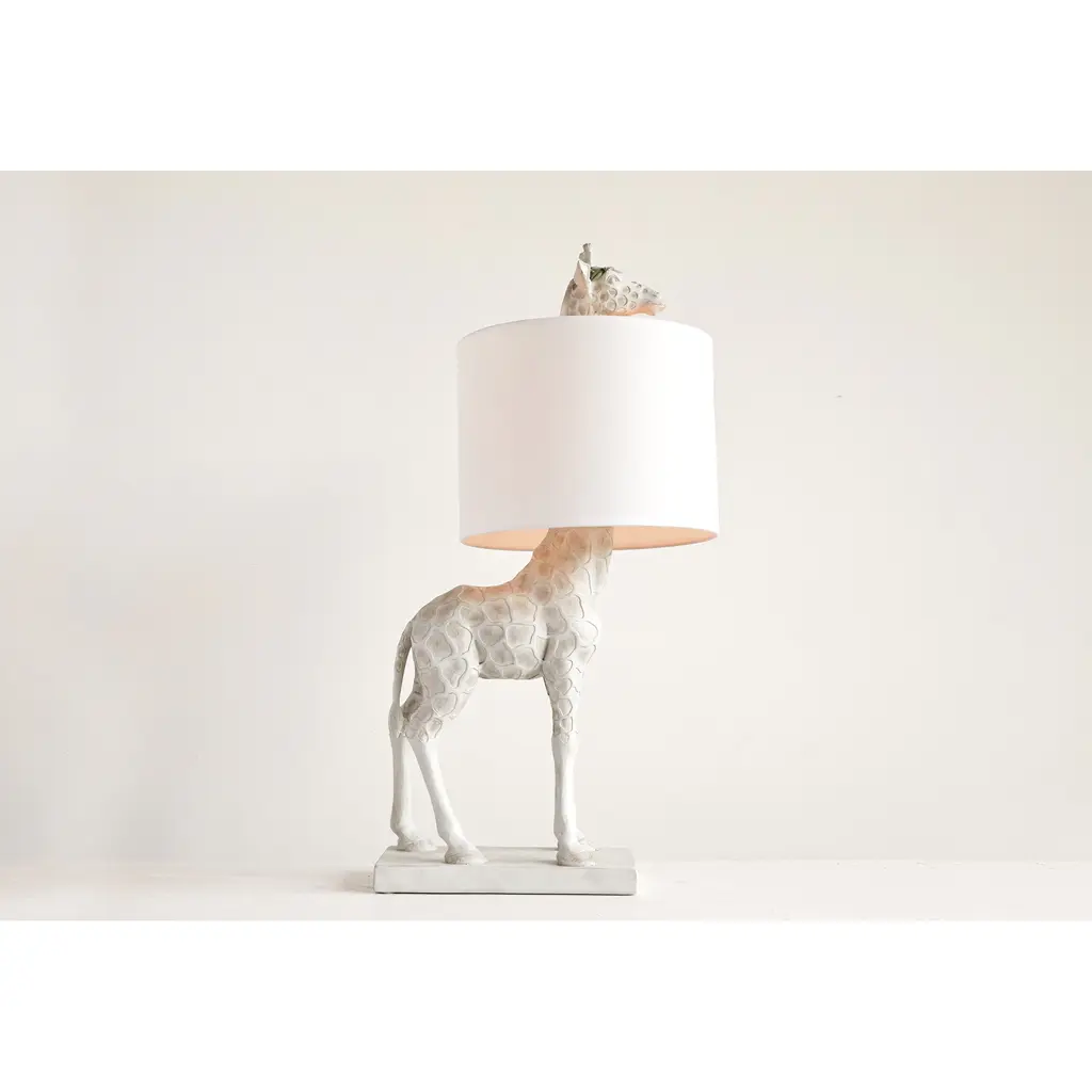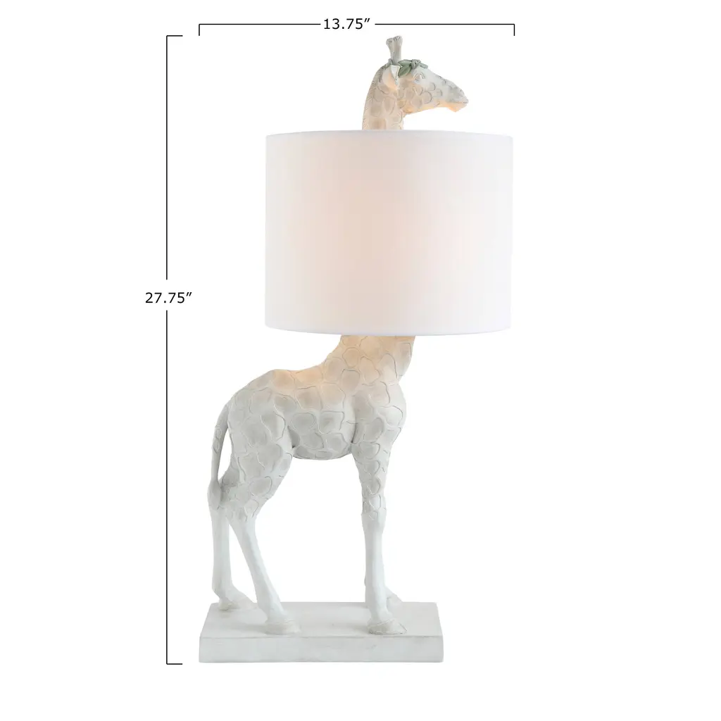 Brighten up the room with this giraffe table lamp that showcases a resin giraffe silhouette in a distressed finish, topped with a linen shade. This whimsical lamp adds a touch of personality and charm to the space while providing a soft and cozy light. The lamp base is made of durable resin with a distressed finish that creates a vintage look. The shade is made of linen with a white color that complements the base. The lamp requires one 40-watt bulb (not included) and has a power switch on the cord for easy operation. The lamp measures 13.75 inches long, 11 inches wide, and 27.75 inches high, and the cord length is 6.5 feet, making it ideal for any table, desk, or nightstand. Spice up the décor with this whimsical giraffe table lamp, which is a great choice for the home.Features: