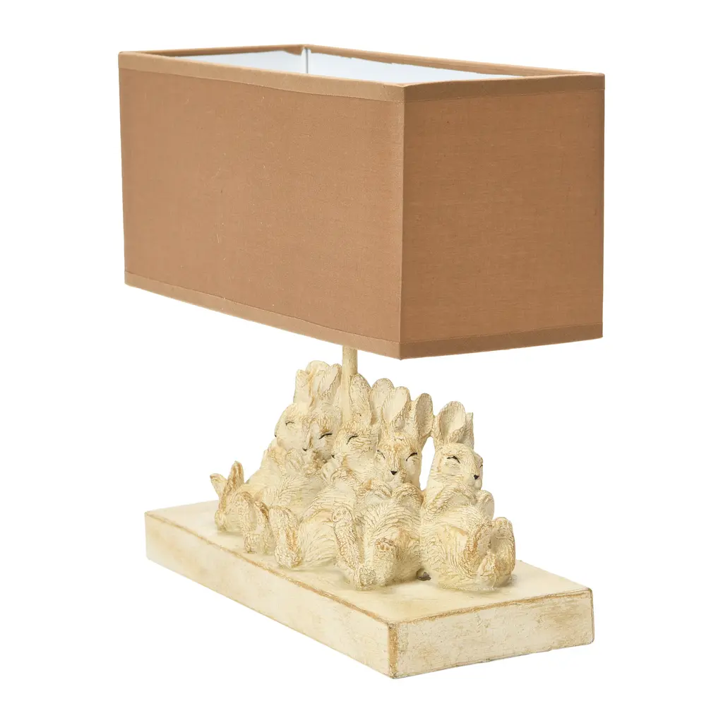 Add some style and personality to the space with this white resin rabbit table lamp. This table lamp showcases a white resin base that has three adorable rabbits in different poses. The rabbits add a touch of contrast and whimsy to the lamp. The lamp is topped with a rectangular linen shade in a sand color that creates a cozy and inviting atmosphere. This table lamp is suitable for enhancing any style of home décor, from rustic to modern. Use it in the living room, bedroom, office, or any other area that needs some extra fun and brightness. This table lamp requires one 40-watt bulb (not included) and is equipped with a rotary switch for easy operation. It measures 114 inches Length x 5.5 inches Width x 13 inches Height, and the cord length is 6.5 feet. Add this white resin rabbit table lamp to the home and enjoy its beauty and functionality. Features: