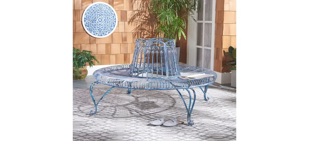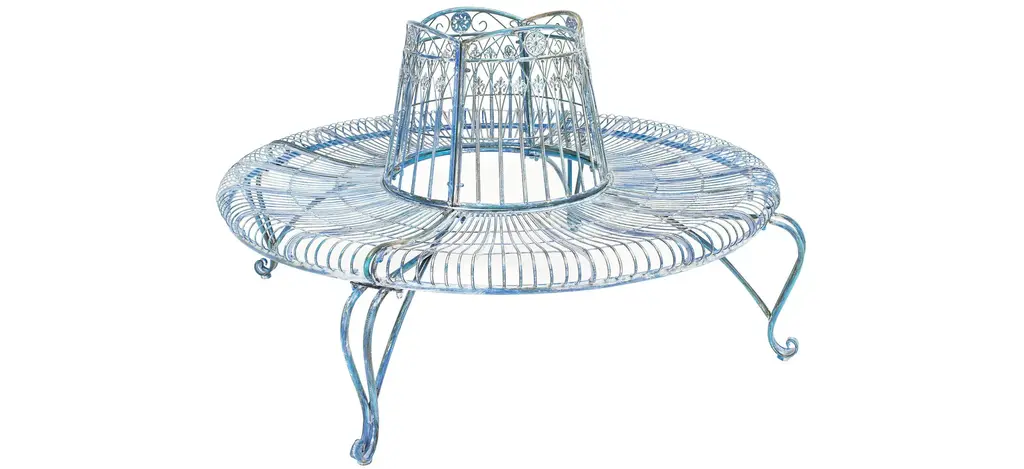 Inspired by one of London's legendary public squares, the outdoor Reslor Darling wrought iron outdoor tree bench blends classic, romantic style with ample seating. Finished in antique white, Reslor's curved iron scrolls lend elegant character to any garden or grounds.