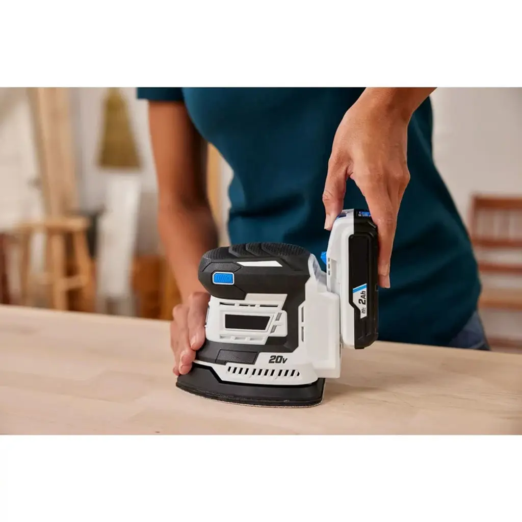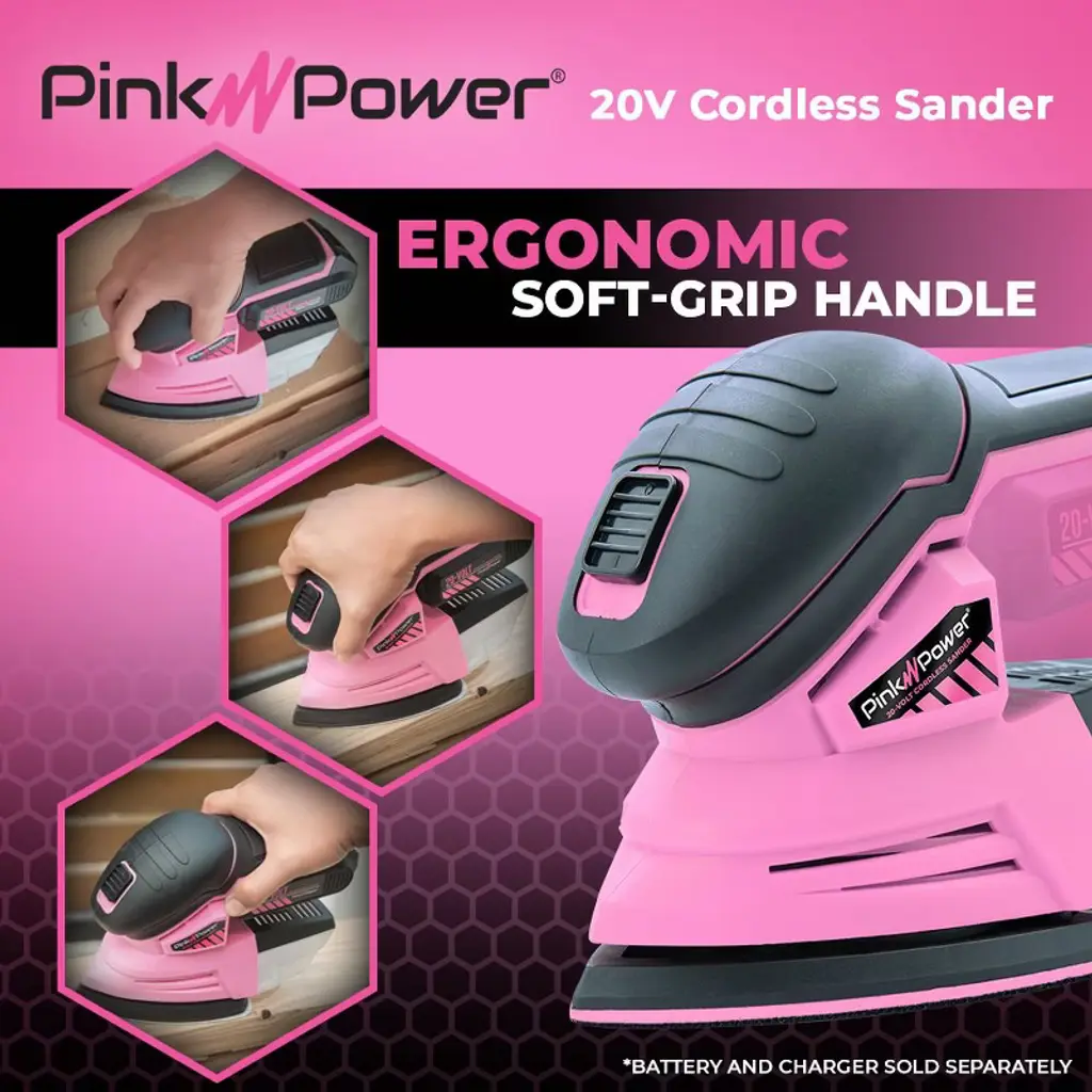 (Refurbished) The Pink Power 20V Detail Sander is designed to give you precision and control for all your woodworking and finishing needs. This cordless handheld sander is ideal for sanding corners, refinishing furniture, finishing cabinets, and adding the final touches to crafting projects. Each sander orbits 11,000 times per minute, delivering smooth and efficient results. The ergonomic, soft-grip handle makes it comfortable to hold and easy to maneuver, while the lightweight design (2.7 lbs. with battery) reduces fatigue during longer projects. The hook-and-loop system allows for quick sandpaper changes, and the built-in dust collection box helps keep your workspace clean. What’s included: (1) 20 Volt Detail Sander, (1) P60, (1) P80, and (1) P120 Sandpaper Pad, plus a full three-year warranty against damage or defects. Please note: Battery and charger are sold separately. To power this tool, you’ll need the Pink Power PP202 Battery and PP204 Charger.