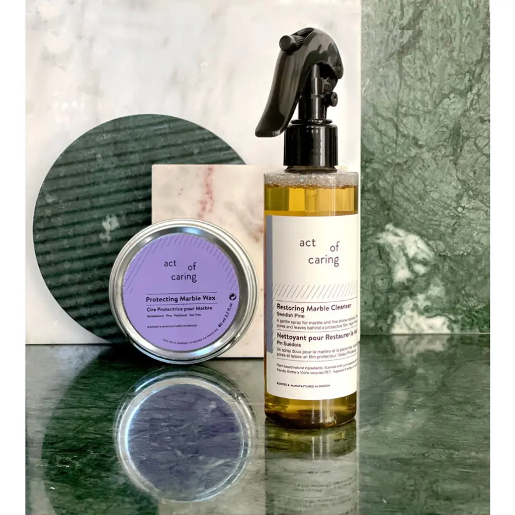 Act of Caring’s Restoring Marble Cleanser is a gentle and safe product designed to keep your precious marble furniture and ornaments beautiful year after year. Containing natural pine oil, the spray purifies the porous stone and forms a protective film on its surface, preventing uneven wearing and staining. For the best result, apply Protective Marble Wax after cleansing. Turn this refill into a convenient spray bottle with the separately sold sprayer head. Made in Sweden, the Act of Caring products are completely plant-based, non-toxic and scented with pure essential oils – perfect for providing gentle care for your beloved items and keeping the surfaces of your home clean without unnecessary chemicals.