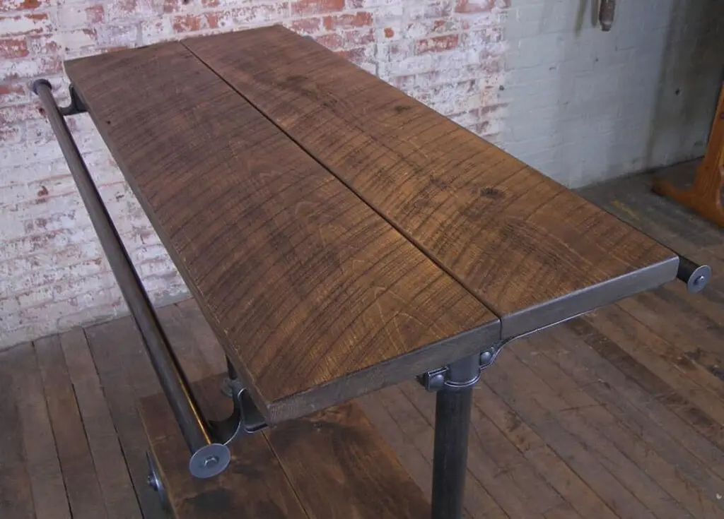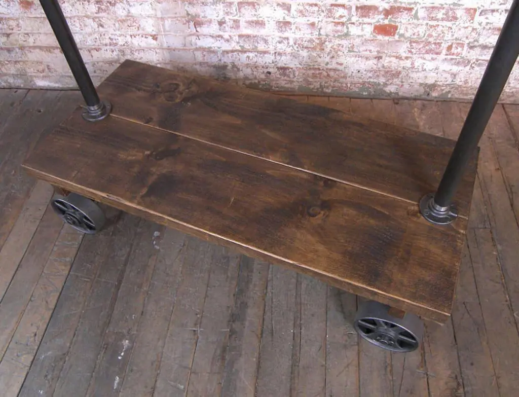 Industrial modern retail / clothing / coat hanging rolling rack. Features cast iron castors, brackets, steel poles and rough sawn pine shelves. Can be made to your specifications. The one pictured measures 48" x 25 1/4" x 58 1/2". Shelf height measures 12". Quantity available.