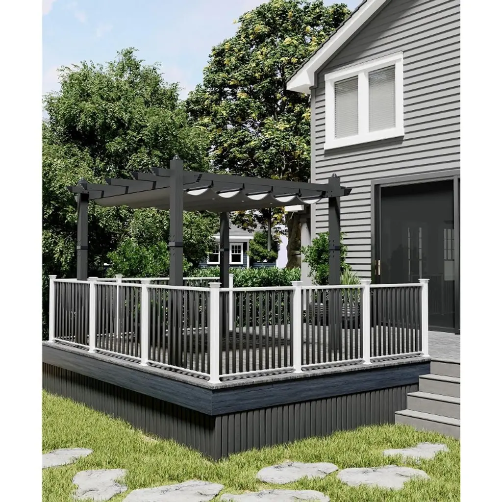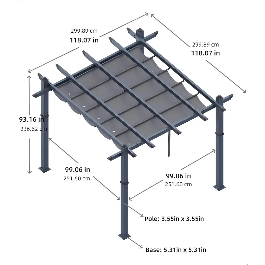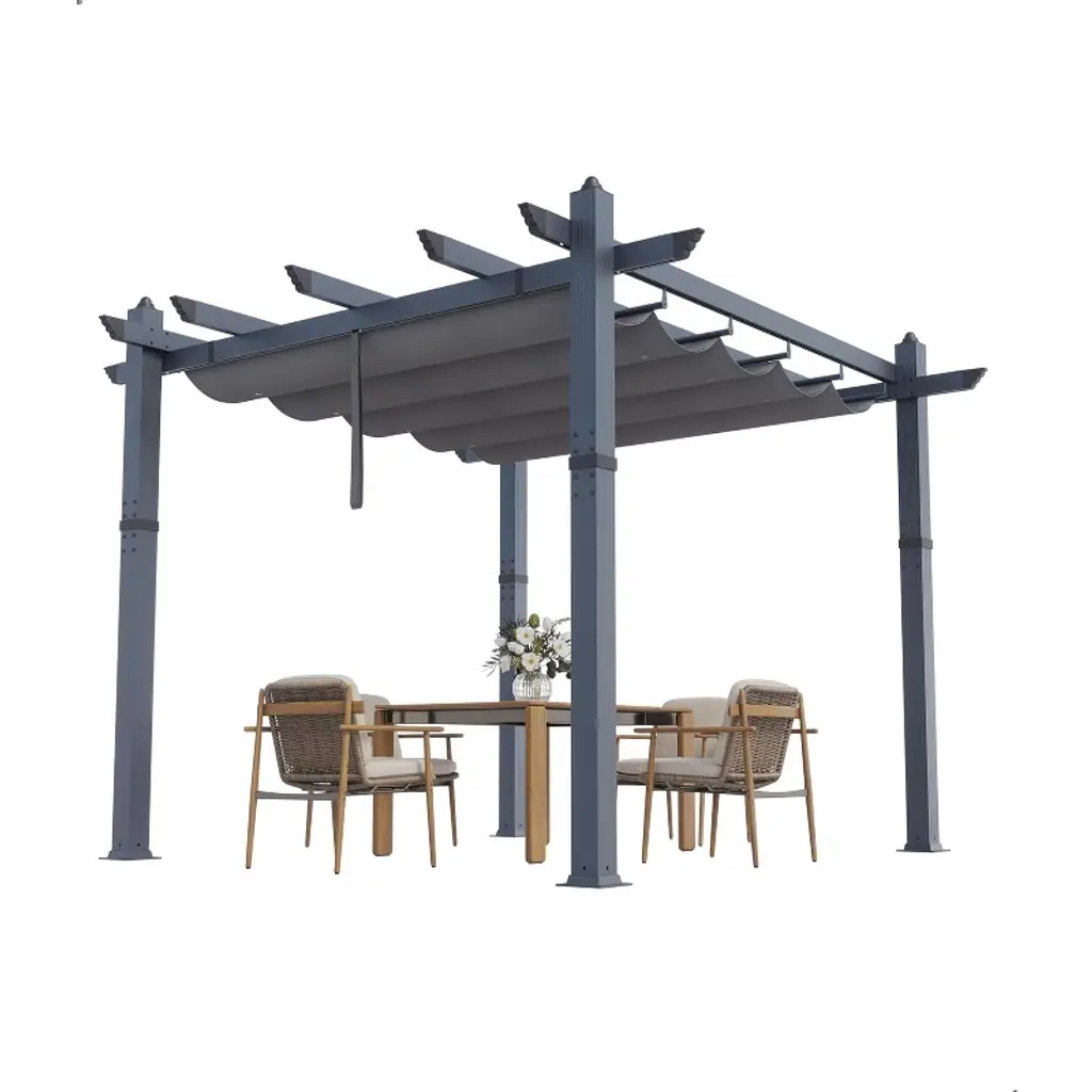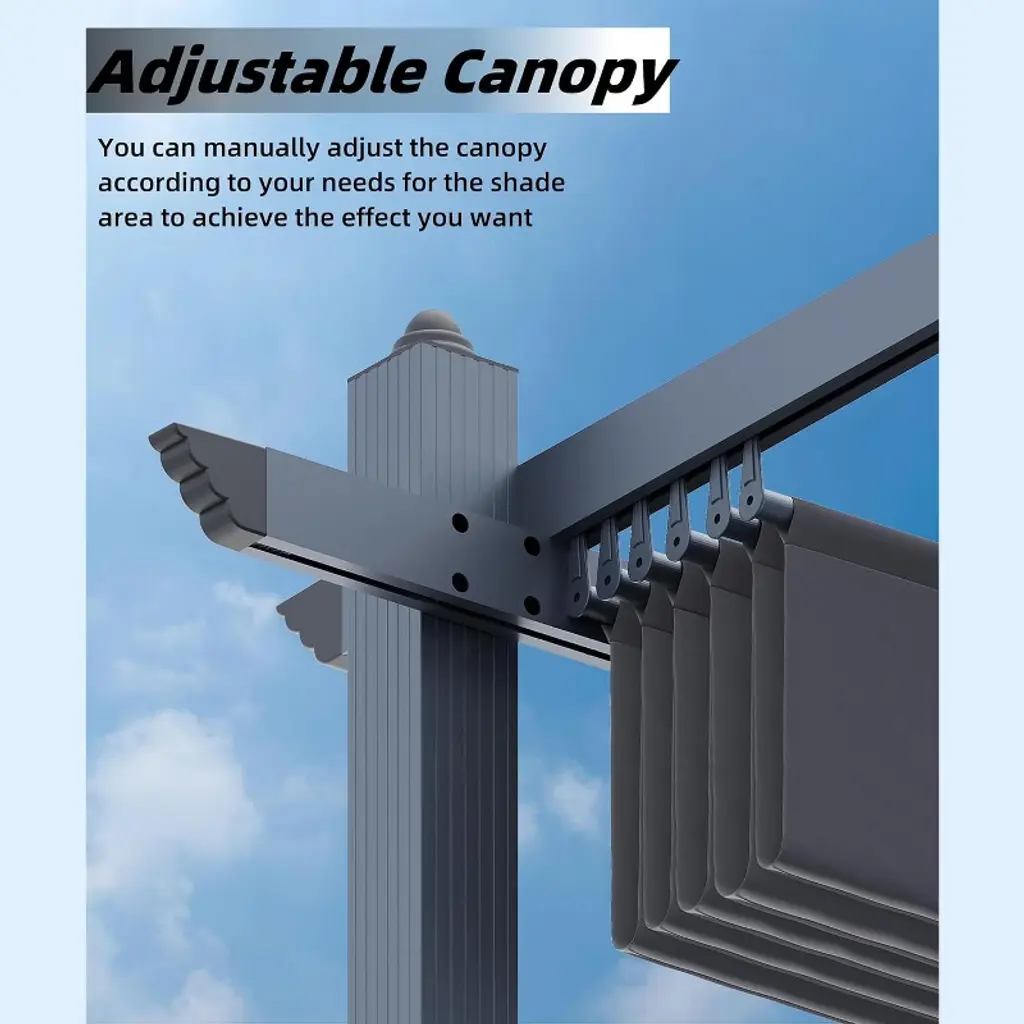 【Product Description】 Highlights at a Glance: ✅ Spacious & Versatile: 10x13 Ft or 10x10 Ft size accommodates gatherings in backyards, patios, or poolside areas. ✅ Retractable Sunshade: Adjustable canopy with waterproof polyester fabric blocks 99% UV rays. ✅ Durable Aluminum Frame: Powder-coated, rust-proof, wood-grain finish for style + weather resistance. ✅ Easy Assembly: Labeled parts + step-by-step instructions for hassle-free setup on flat ground. ✅ Modern Aesthetic: Sleek wood-grain design blends seamlessly into gardens, decks, or porches. Specifications Sizes: 10x10 Ft: 77 lbs 10x13 Ft: 88 lbs Colors: Khaki / Blue / White / Gray Material: Heavy-duty aluminum frame + polyester canopy. Friendly Note ? Large Package Alert: Requires 2+ people for assembly. Anchor posts with gravel for added stability in windy conditions. Packing List 1x Aluminum Pergola Frame 1x Retractable Canopy 1x Instruction Manual 1x Hardware Kit Why Choose This Pergola? Combining industrial-strength durability, customizable shade, and sleek wood-grain aesthetics, this freestanding pergola transforms outdoor spaces into stylish, functional retreats—perfect for entertaining or unwinding under the sun!