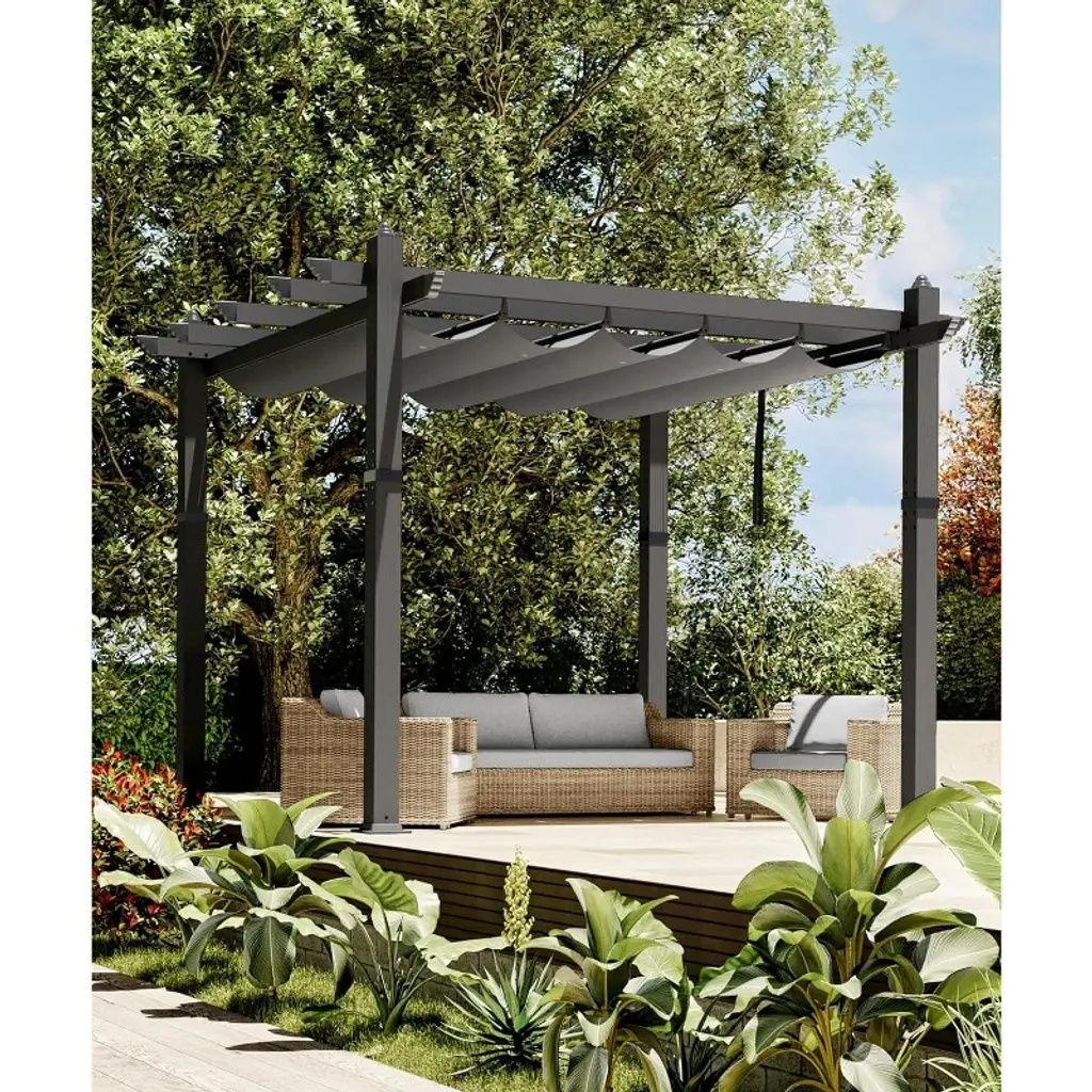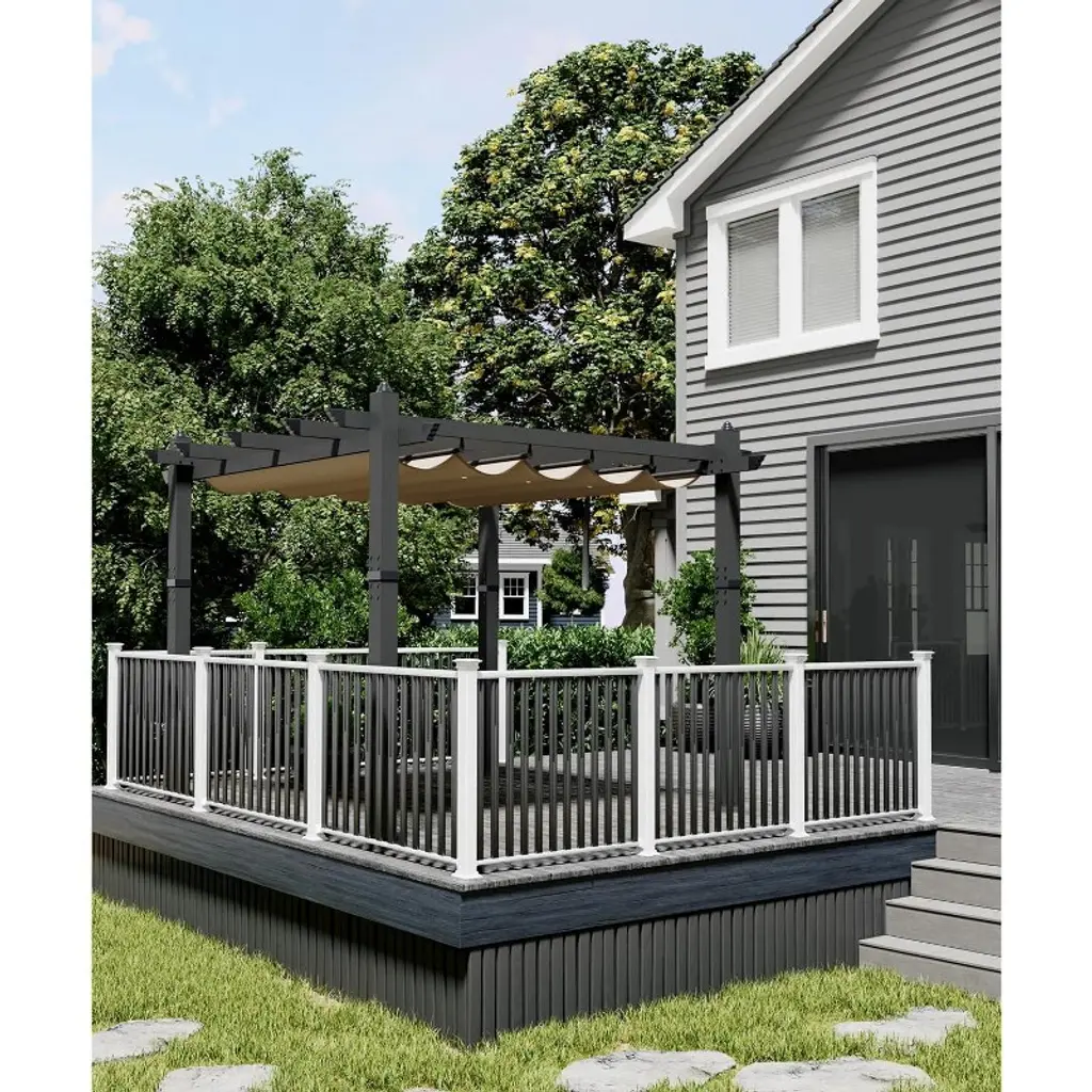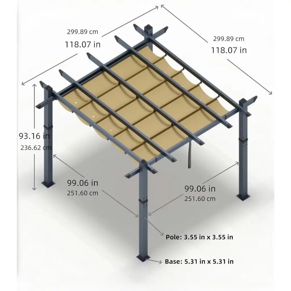 【Product Description】 Highlights at a Glance: ✅ Spacious & Versatile: 10x13 Ft or 10x10 Ft size accommodates gatherings in backyards, patios, or poolside areas. ✅ Retractable Sunshade: Adjustable canopy with waterproof polyester fabric blocks 99% UV rays. ✅ Durable Aluminum Frame: Powder-coated, rust-proof, wood-grain finish for style + weather resistance. ✅ Easy Assembly: Labeled parts + step-by-step instructions for hassle-free setup on flat ground. ✅ Modern Aesthetic: Sleek wood-grain design blends seamlessly into gardens, decks, or porches. Specifications Sizes: 10x10 Ft: 77 lbs 10x13 Ft: 88 lbs Colors: Khaki / Blue / White / Gray Material: Heavy-duty aluminum frame + polyester canopy. Friendly Note ? Large Package Alert: Requires 2+ people for assembly. Anchor posts with gravel for added stability in windy conditions. Packing List 1x Aluminum Pergola Frame 1x Retractable Canopy 1x Instruction Manual 1x Hardware Kit Why Choose This Pergola? Combining industrial-strength durability, customizable shade, and sleek wood-grain aesthetics, this freestanding pergola transforms outdoor spaces into stylish, functional retreats—perfect for entertaining or unwinding under the sun!