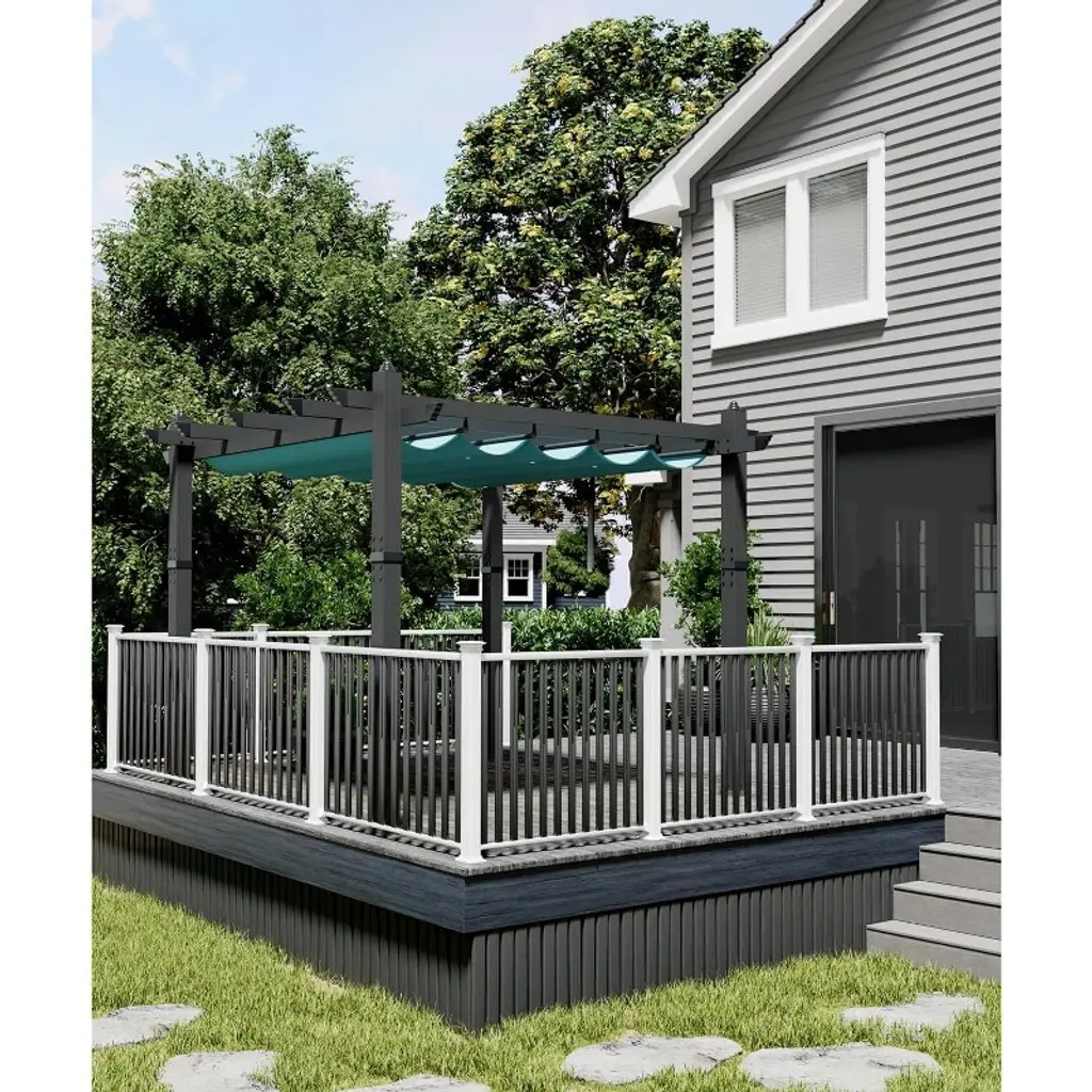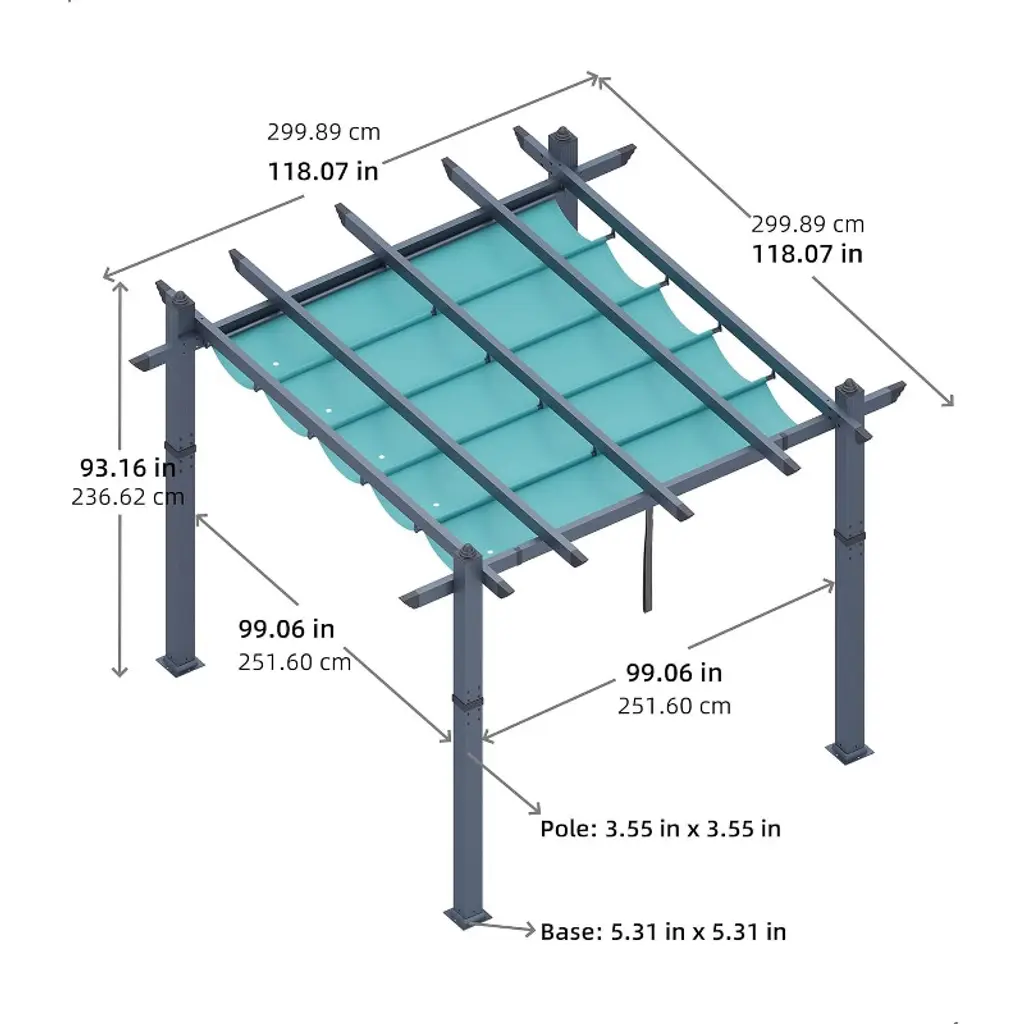 【Product Description】 Highlights at a Glance: ✅ Spacious & Versatile: 10x13 Ft or 10x10 Ft size accommodates gatherings in backyards, patios, or poolside areas. ✅ Retractable Sunshade: Adjustable canopy with waterproof polyester fabric blocks 99% UV rays. ✅ Durable Aluminum Frame: Powder-coated, rust-proof, wood-grain finish for style + weather resistance. ✅ Easy Assembly: Labeled parts + step-by-step instructions for hassle-free setup on flat ground. ✅ Modern Aesthetic: Sleek wood-grain design blends seamlessly into gardens, decks, or porches. Specifications Sizes: 10x10 Ft: 77 lbs 10x13 Ft: 88 lbs Colors: Khaki / Blue / White / Gray Material: Heavy-duty aluminum frame + polyester canopy. Friendly Note ? Large Package Alert: Requires 2+ people for assembly. Anchor posts with gravel for added stability in windy conditions. Packing List 1x Aluminum Pergola Frame 1x Retractable Canopy 1x Instruction Manual 1x Hardware Kit Why Choose This Pergola? Combining industrial-strength durability, customizable shade, and sleek wood-grain aesthetics, this freestanding pergola transforms outdoor spaces into stylish, functional retreats—perfect for entertaining or unwinding under the sun!