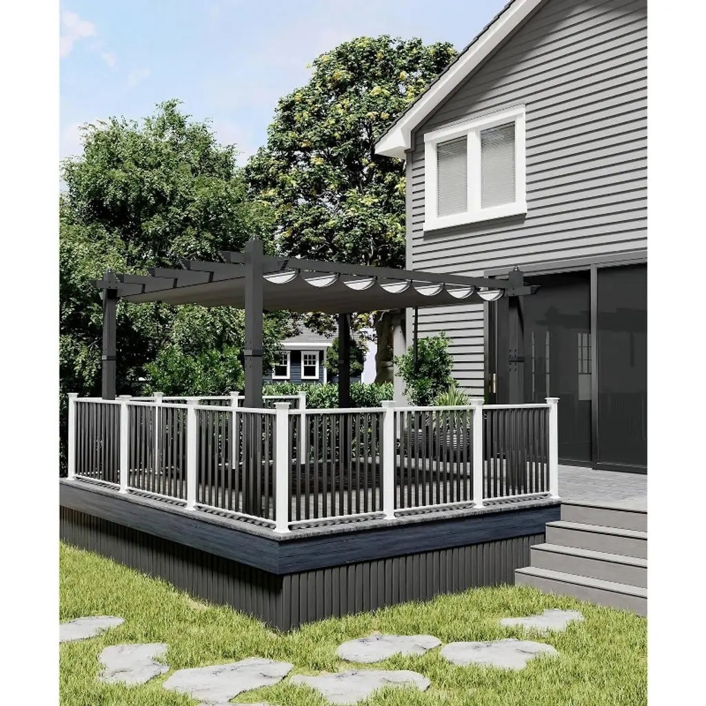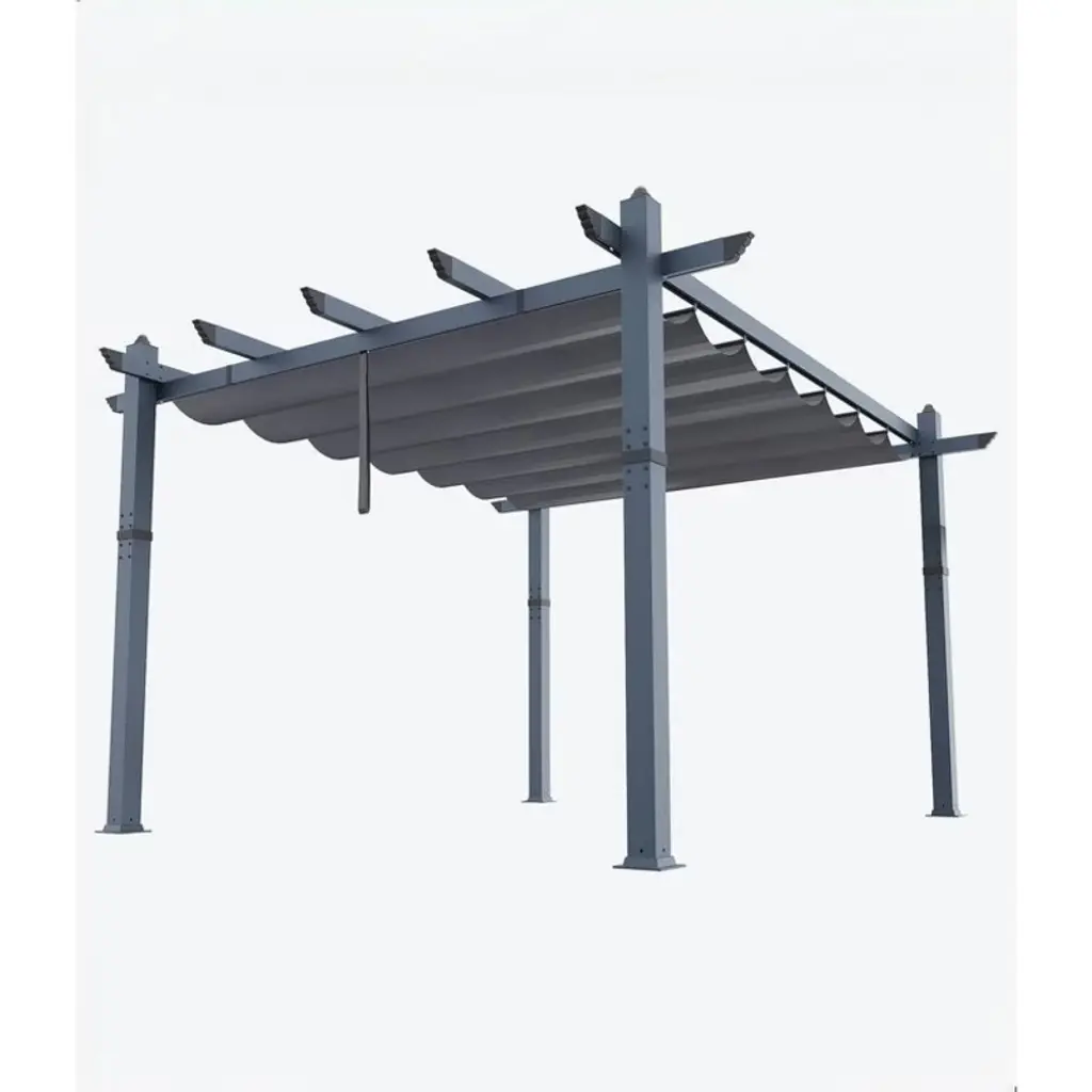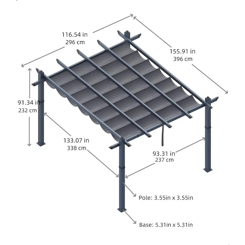 【Product Description】 Highlights at a Glance: ✅ Spacious & Versatile: 10x13 Ft or 10x10 Ft size accommodates gatherings in backyards, patios, or poolside areas. ✅ Retractable Sunshade: Adjustable canopy with waterproof polyester fabric blocks 99% UV rays. ✅ Durable Aluminum Frame: Powder-coated, rust-proof, wood-grain finish for style + weather resistance. ✅ Easy Assembly: Labeled parts + step-by-step instructions for hassle-free setup on flat ground. ✅ Modern Aesthetic: Sleek wood-grain design blends seamlessly into gardens, decks, or porches. Specifications Sizes: 10x10 Ft: 77 lbs 10x13 Ft: 88 lbs Colors: Khaki / Blue / White / Gray Material: Heavy-duty aluminum frame + polyester canopy. Friendly Note ? Large Package Alert: Requires 2+ people for assembly. Anchor posts with gravel for added stability in windy conditions. Packing List 1x Aluminum Pergola Frame 1x Retractable Canopy 1x Instruction Manual 1x Hardware Kit Why Choose This Pergola? Combining industrial-strength durability, customizable shade, and sleek wood-grain aesthetics, this freestanding pergola transforms outdoor spaces into stylish, functional retreats—perfect for entertaining or unwinding under the sun!