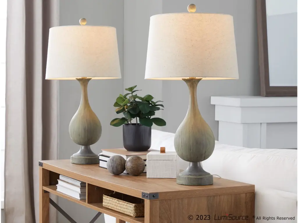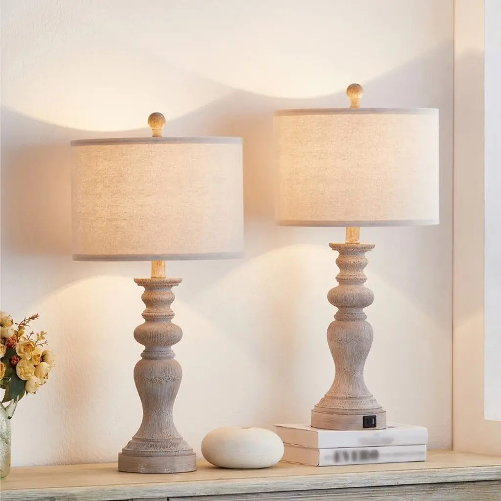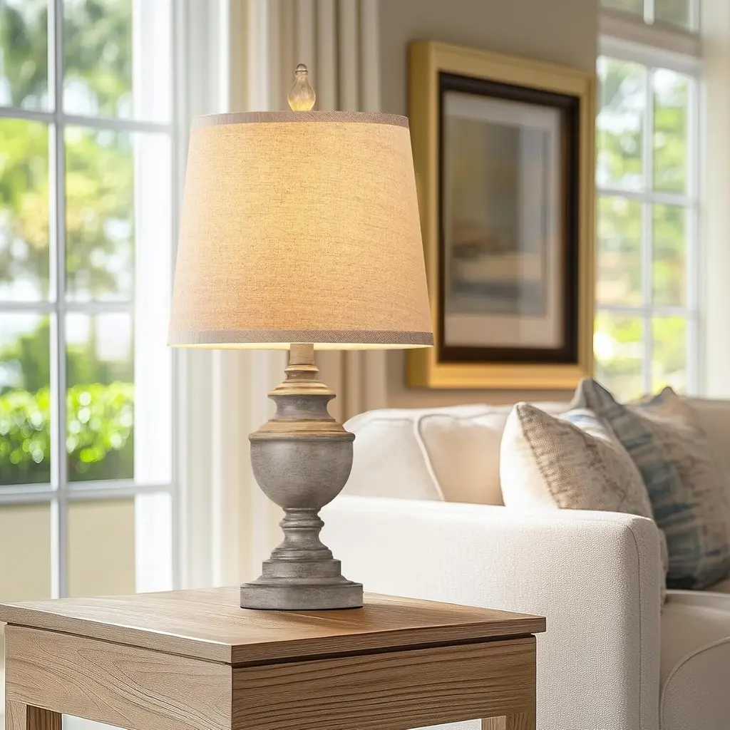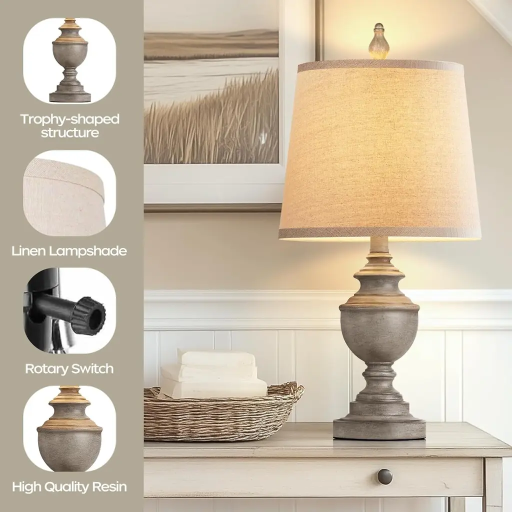 Classic & Versatile Design - Featuring a beautifully crafted resin lamp body and a white fabric shade, this table lamp set exudes a vintage yet modern charm. Its timeless aesthetic effortlessly complements various decor styles, including industrial, minimalist, Scandinavian, and farmhouse.Soft & Cozy Lighting - Emitting a warm, soothing glow, this lamp creates a relaxing ambiance ideal for reading, unwinding, or entertaining guests. Whether placed in the bedroom or living room, it enhances your space with both functionality and elegance.Durable & Safe Construction - Made from high-quality materials, this bedside lamp is designed for longevity and safety. The sturdy construction ensures durability, while its premium finish maintains its elegant appearance over time. Each lamp requires a 60W bulb (not included).Perfect Gift & Ideal Size - With a compact yet stylish 22-inch height, this lamp fits perfectly on nightstands, end tables, or consoles. It makes a thoughtful gift for housewarmings, birthdays, holidays, or any special occasion, bringing warmth and charm to any home.Quick & Easy Assembly - Designed for convenience, this lamp set can be assembled in just minutes without any tools. Simply follow the straightforward instructions and enjoy your new lighting instantly.