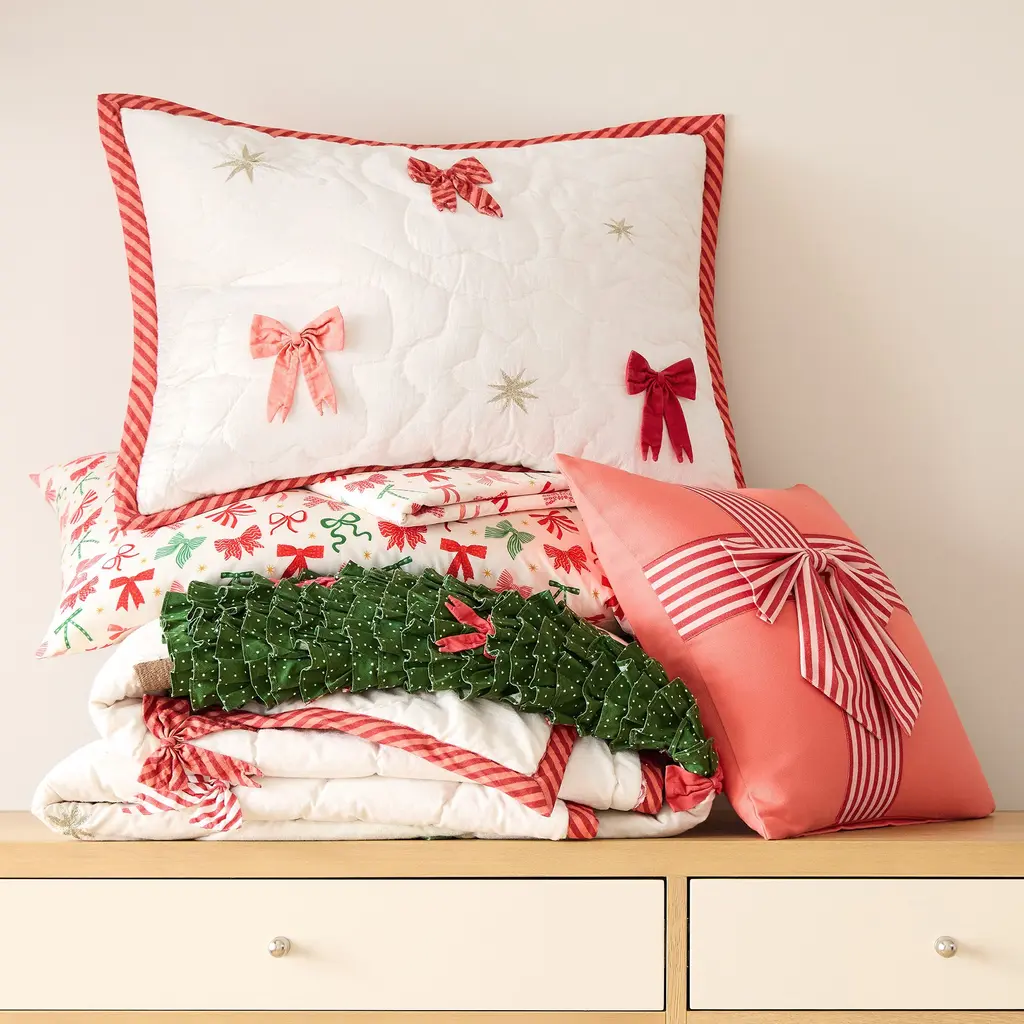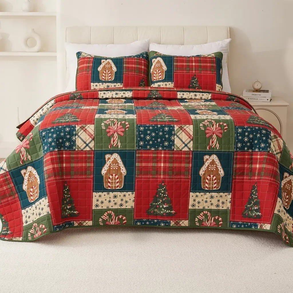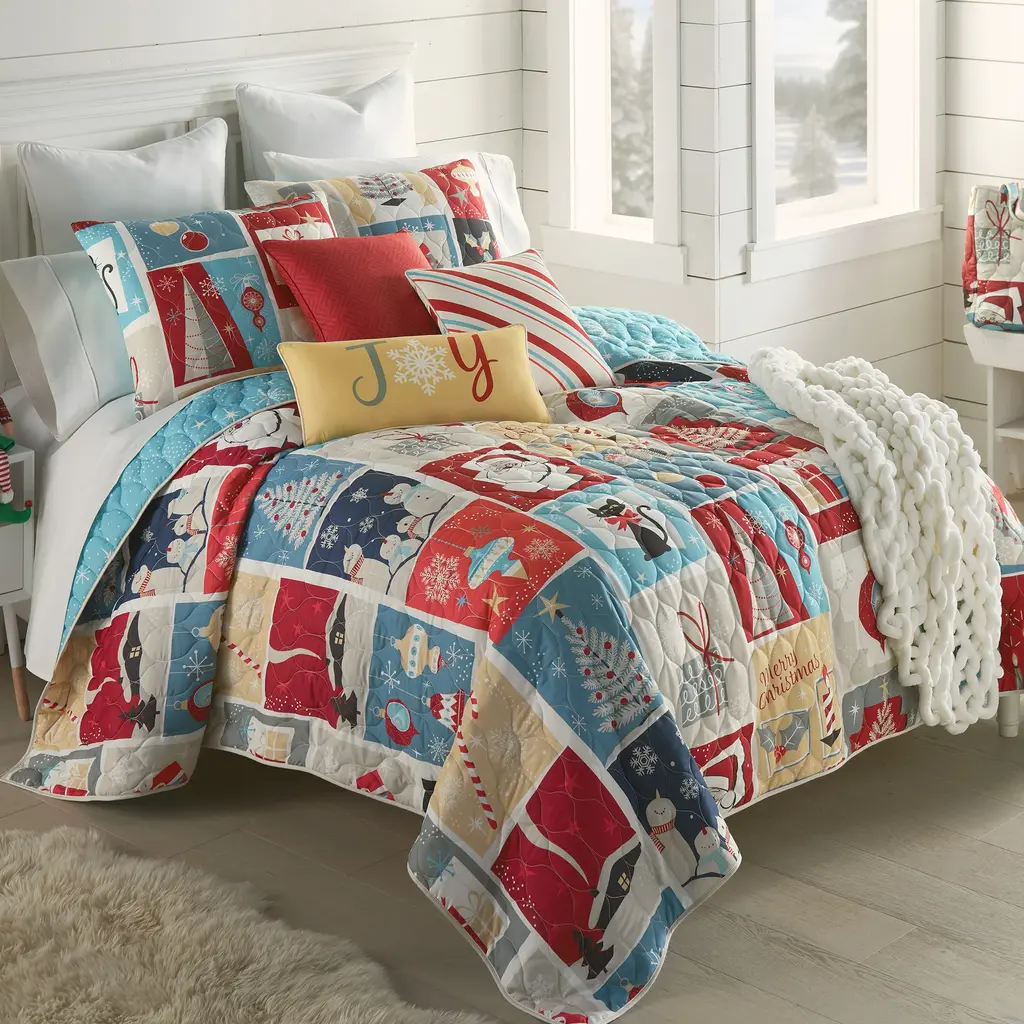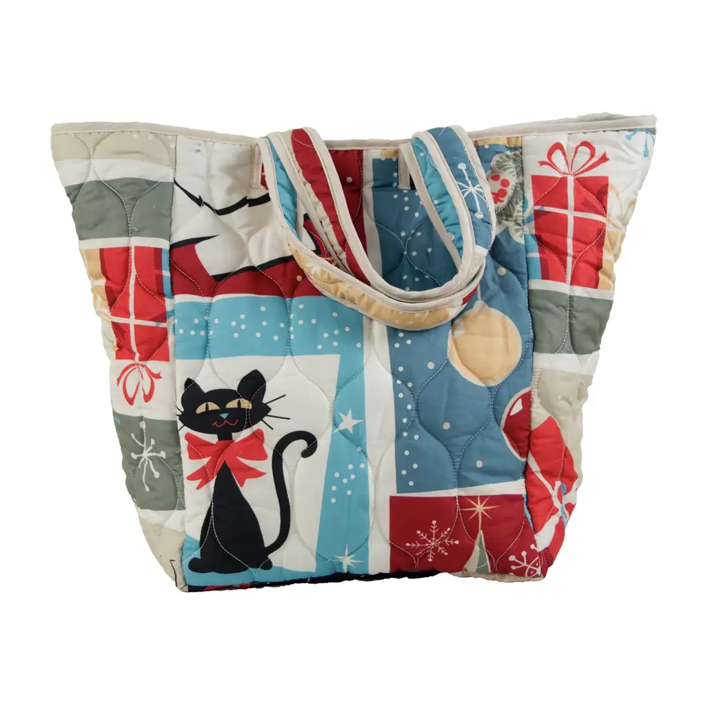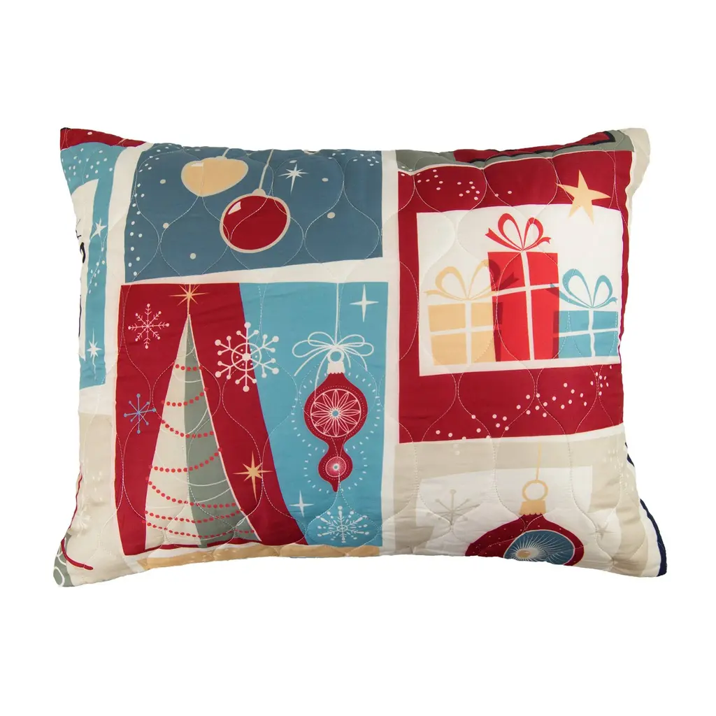Transform your bedroom into a winter wonderland with the Retro Christmas Quilted Bedding Set from Your Lifestyle by Donna Sharp. This vibrant light weight ensemble captures the joyous spirit of mid-century Christmas celebrations, adorned with a delightful array of festive motifs. Santa, stockings, candy canes, wreaths, cats, ornaments, presents, holly, snowflakes, and Christmas trees come together to create a charming and nostalgic atmosphere. With its classic holiday red, bright red, yellow-gold, green, pale blue, navy, charcoal, tan, and off-white hues, this bedding set perfectly captures the traditional colors of Christmas. Each shade evokes a sense of warmth and cheer, transporting you to a cozy and festive environment. Crafted with meticulous attention to detail, this set includes a lightweight quilt and two shams (twin size includes one sham) and comes packaged inside a free matching tote bag. (Image on sham may vary slightly) The quilt is reversible, allowing you to effortlessly switch between a vibrant pattern and a stylish print, ensuring versatility and flexibility in your bedroom décor. All accessories sold separately. 100% Brushed Microfiber, Machine washable. Features: