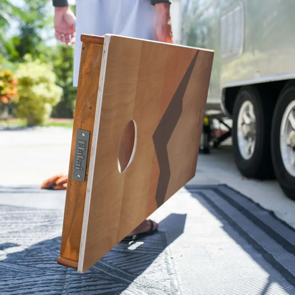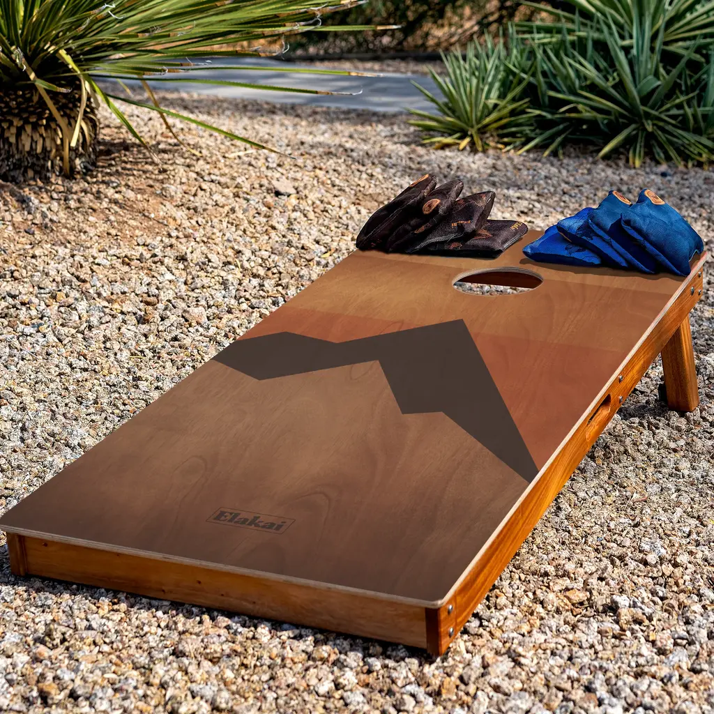 Carefully crafted from the finest materials, this two-by-four-foot regulation cornhole board set features a premium grade plywood deck with a beautiful mahogany frame. Outdoor-inspired graphics are printed directly to the wood surface.Proud partners of the National Forest Foundation and 1% for the Planet, Elakai is dedicated to protecting the environment as well as investing in social experiences. Their games are handmade from carefully-selected premium materials. Processed in small batches to the highest standards, each piece is unique and durable. Enjoy the outdoors with Elakai.Note: When not in use, this product needs to be stored indoors.