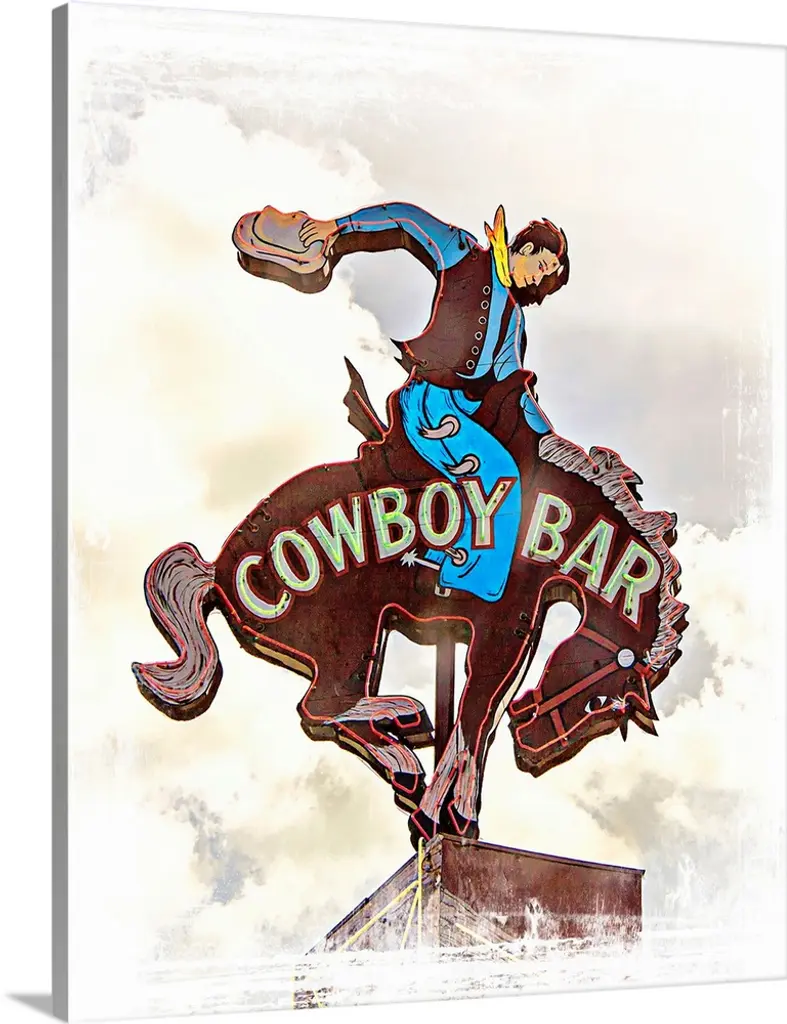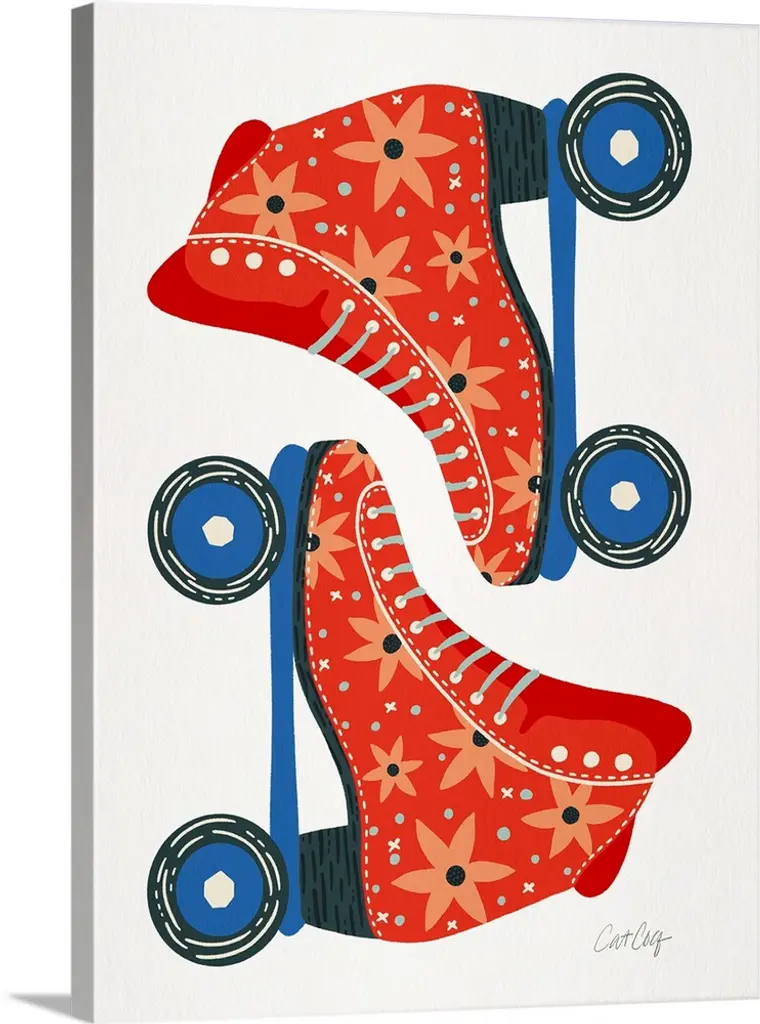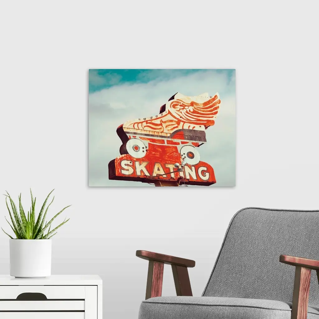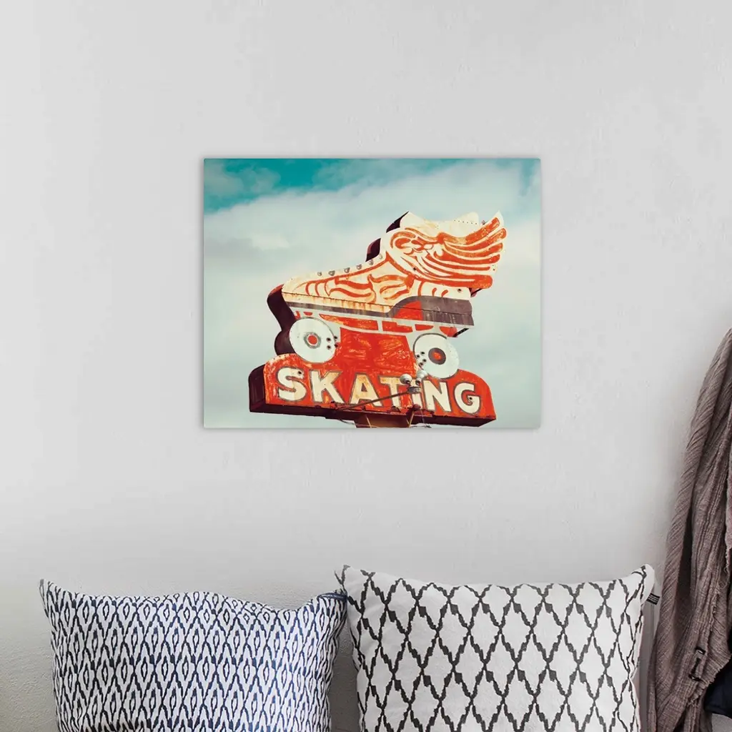 Photograph of a vintage orange roller skating sign on a cloudy sky background.