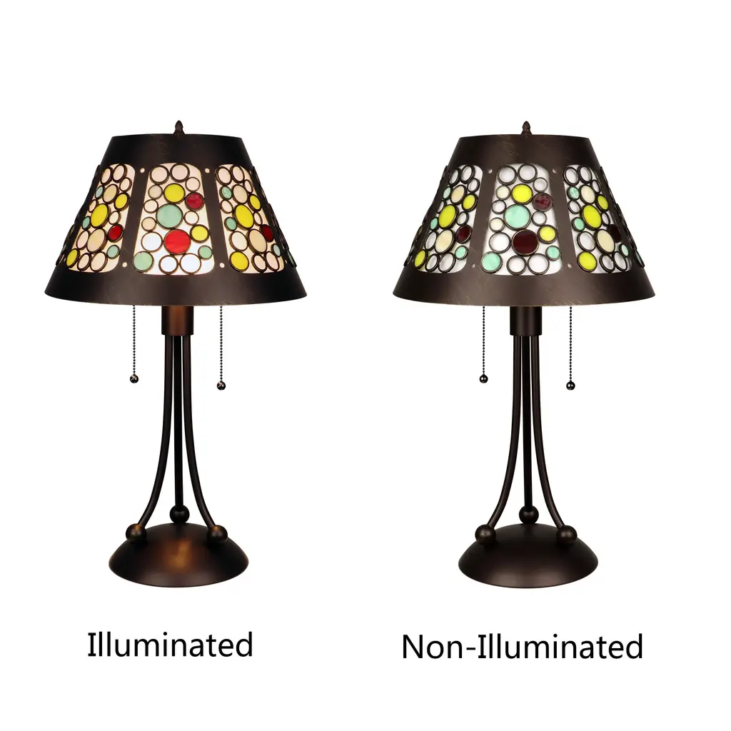 New to the Chloe spotlight is the beautiful Retro-Style line! These lamps are made up of stained glass pieces that are carefully inserted into metal frames, no soldering! This lamp is made up of 72 pieces of hand-cut art glass and features a unique base design, sure to compliment your modern home decor. The exact color of each glass piece may vary due to each piece being hand crafted. First image is with the light shining through, second image is with no light. Dry listed and recommended for an indoor setting. Features: Since these are hand-crafted products, the exact color of glass pieces may vary. Colors of the glass will appear darker and less vibrant when not illuminated. Handmade glass will vary from one piece to the other; glass made at different times will also vary. Light bulbs used in lamps or ambient lighting may affect the appearance of the products. Stained glass product has been protected with mineral oil as part of the finishing process. Please use a soft dry cloth to remove any excess oil.