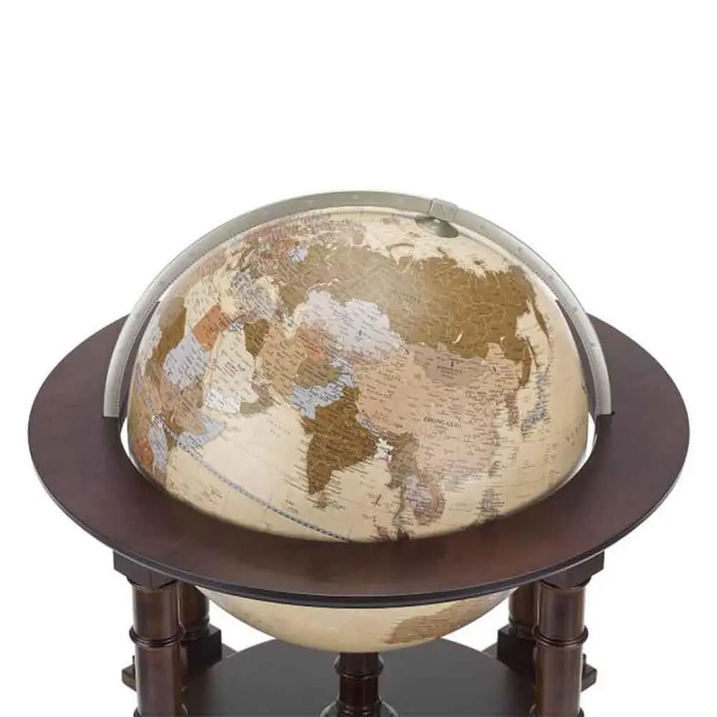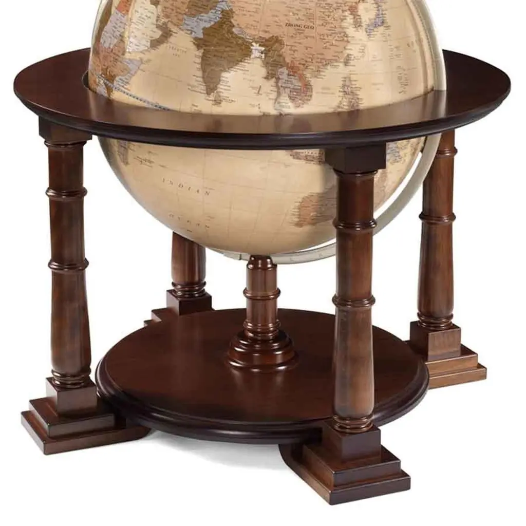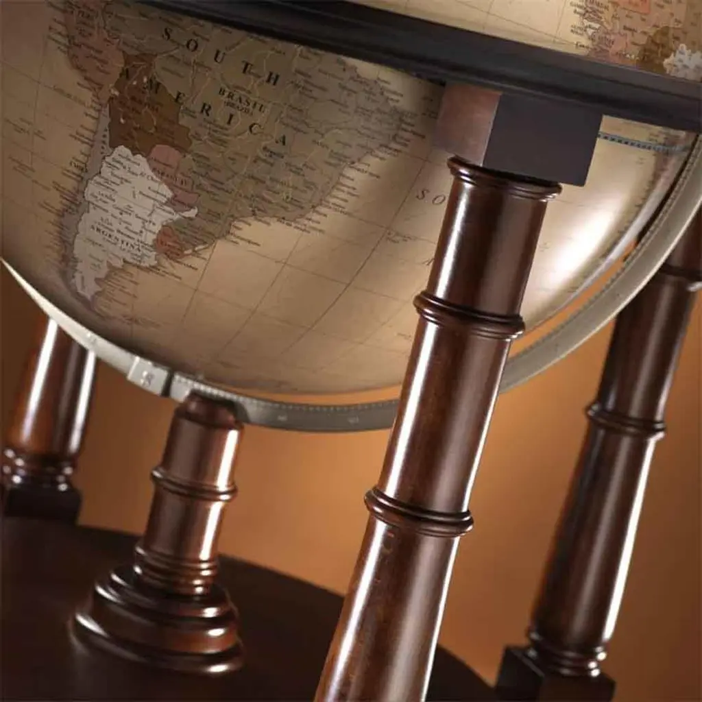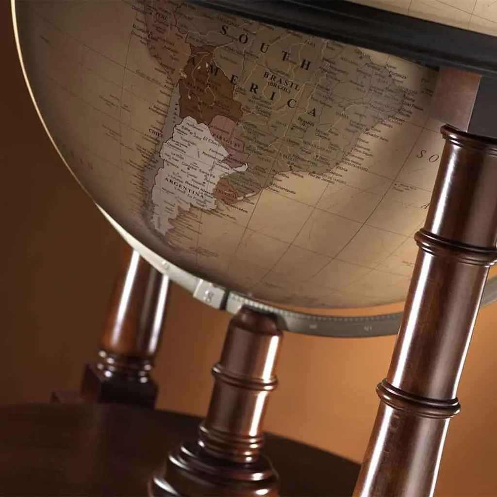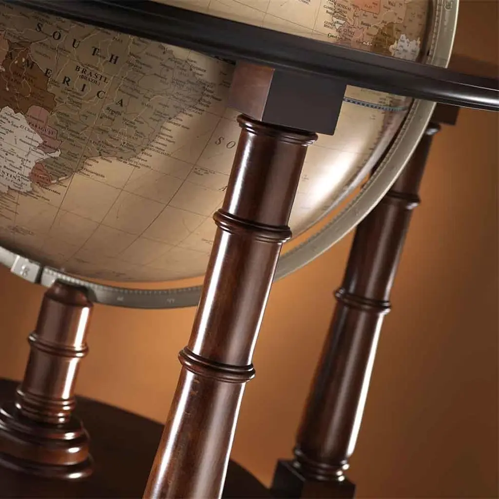 Globe retro walnut with base structure with solidbeech wood feet and with circled structure in Africanwalnut wood. Globe in beige finish with aluminiummeridian in brass finish.