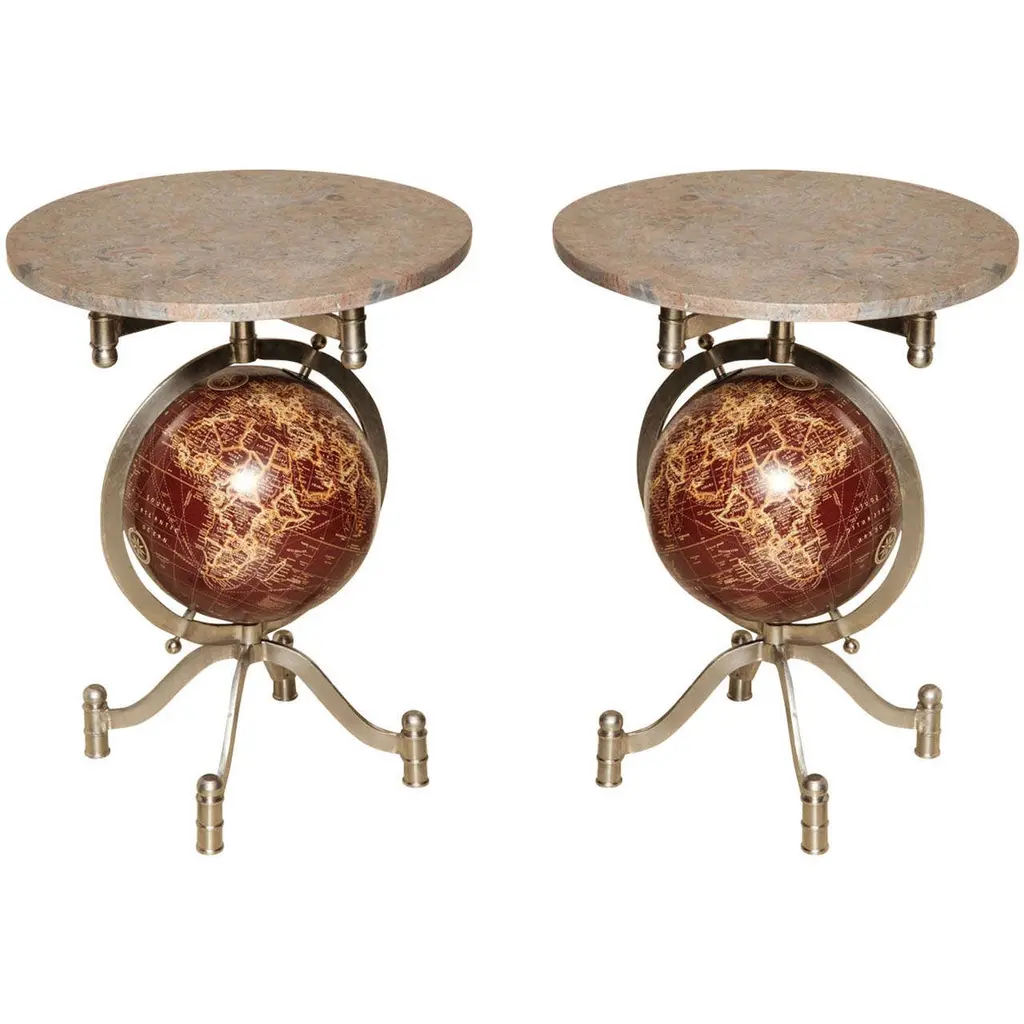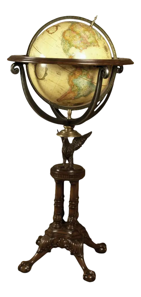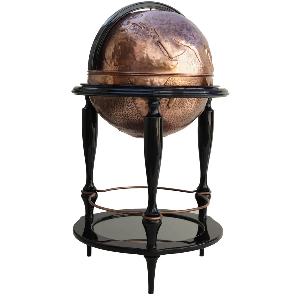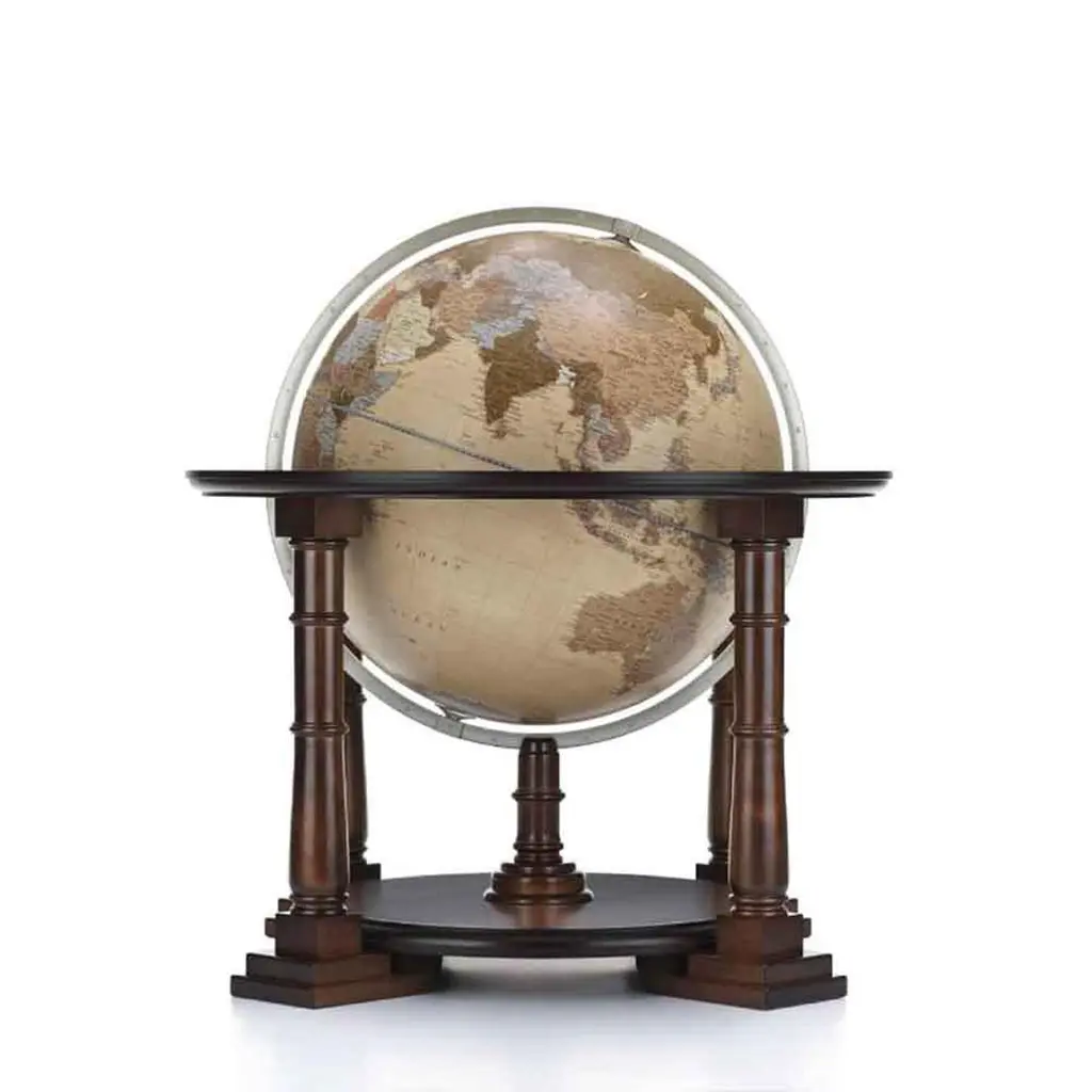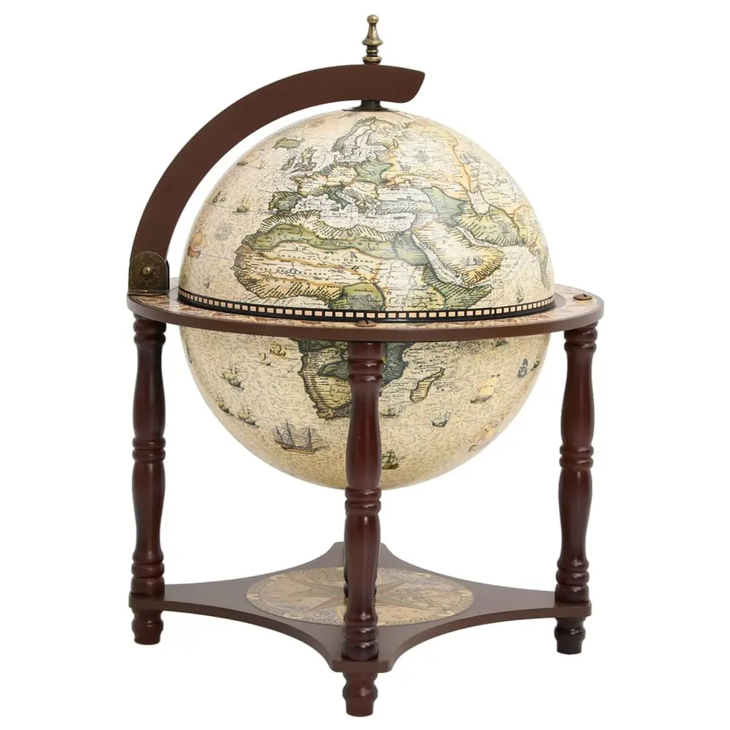 Globe retro walnut with base structure with solidbeech wood feet and with circled structure in Africanwalnut wood. Globe in beige finish with aluminiummeridian in brass finish.