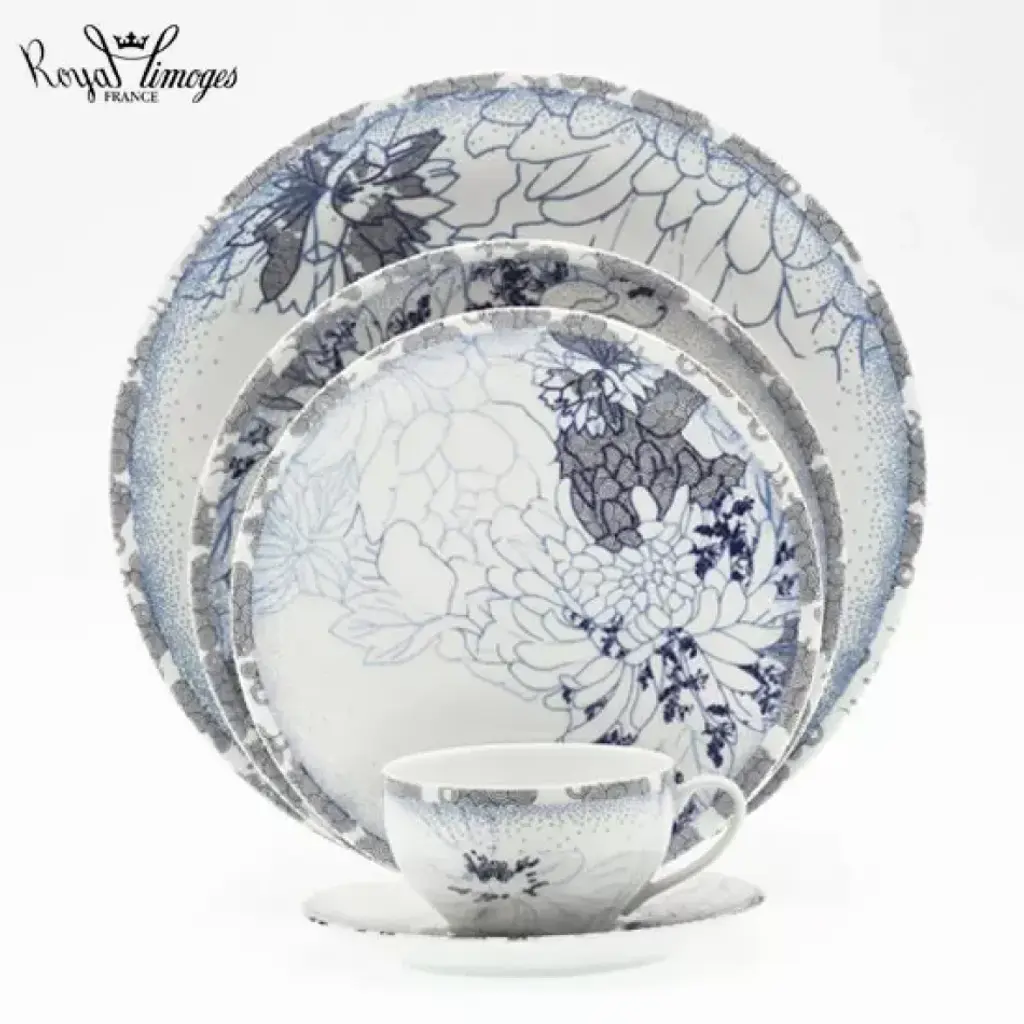 An elegant floral pattern in blue and grey tones decorates this dinnerware pattern. Five-piece place setting includes dinner plate, dessert plate, bread/butter plate, teacup, and saucer. As the oldest porcelain factory in the French city of Limoges, Royal Limoges boasts a long history of creating hand crafted dinnerware from its own kaolin clay. Since 1797, its exclusive patterns have been enjoyed by clients worldwide.