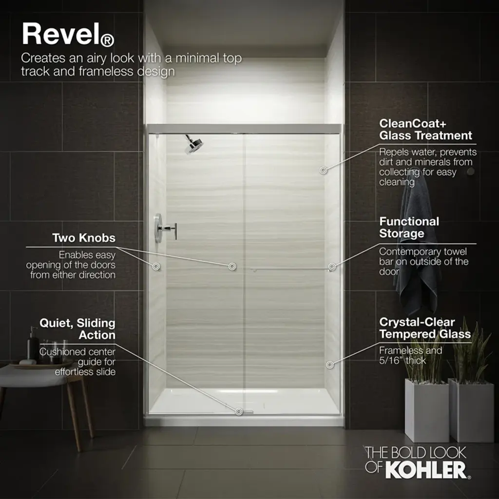 The Revel shower door creates an open, airy look with its frameless design, minimal top track, and clear wall jambs. Designed for easy personalization, the Revel series is available in a full range of Kohler finishes and height and glass options, so you can choose the ideal door for your needs. The glass offers a luxurious, heavier feel. Revel frameless bath and shower doors combine superior performance with sleek, minimalist design for the perfect complement to your bathing and showering space.