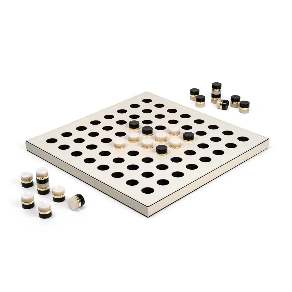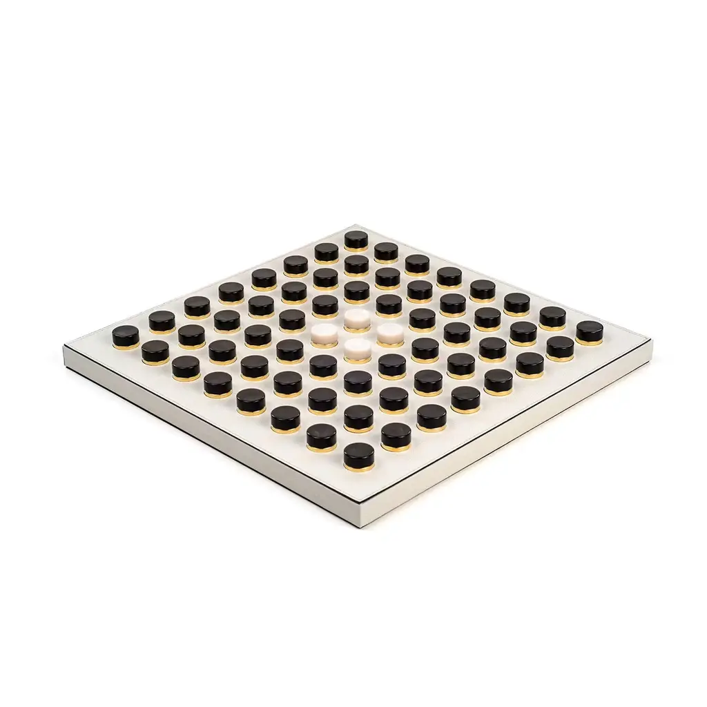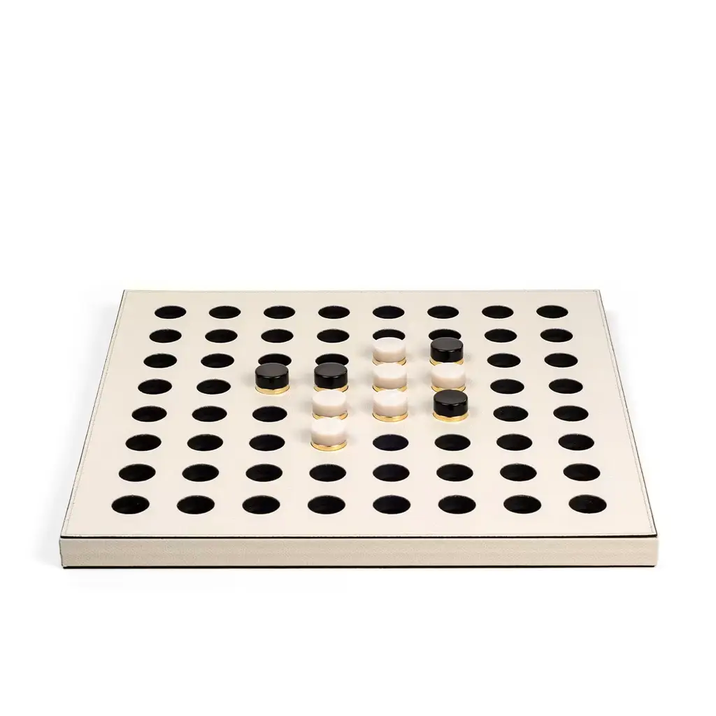 A must-have to complement their luxury game collections, this sophisticated Reversi game set for two players features an uncheckered wooden board of unrivaled class, completely upholstered with exquisite beige leather. The 60 black pieces and the four central white pieces are respectively crafted of faux nacre for a further accent of refinement. Details in luminous brass.