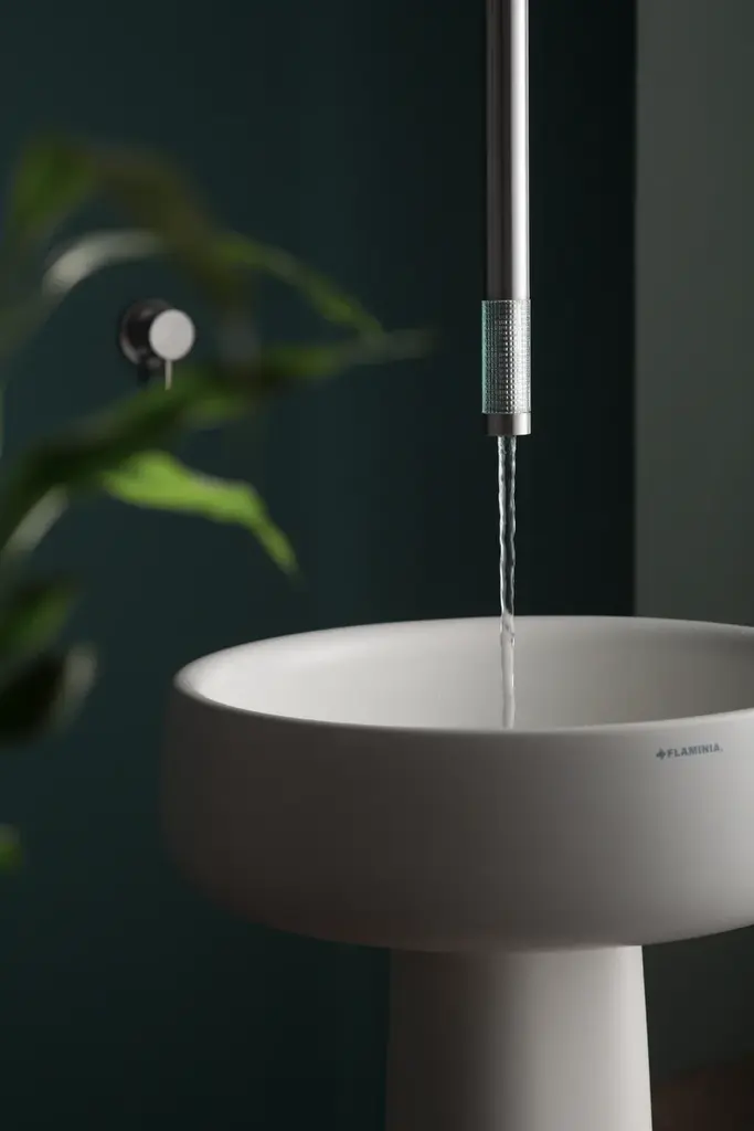 REVITRUM|Ceiling-mounted sink spout, Ø 34 mm, with reused glass detail. It can be matched with built-in mixer and countertop basin mixer.Available finishes: Brushed stainless steel, Deep grey inox, ceraMINA colors.Dressing stainless steel with reused glass details. REvitrum is a custom-made production meant to enrich space with vintage details of industrial taste, always keeping elegance and accuracy of Mina mood. It is one of a kind like everybody’s story. A document tells a little bit where glasses come from. The collection is also available in a CeraMINA version: a palette of ceramic colours with pearl shades designed to find the most suitable shade for every project.From pearl black to calm green, passing through sweet blue, light rose, rich brown, vivid orange and golden yellow.