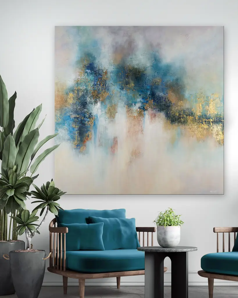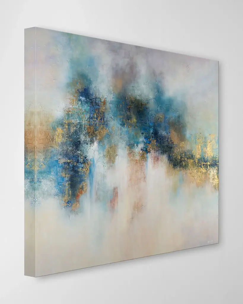 "Celestial Gilding" by artist H. Scott exudes sophistication, elevating your space with its tranquil, soothing colors and shimmering gold leaf. Handcrafted giclee on gallery-wrapped canvas Hand-embellished with gold leaf Overall, approx. 60"Sq. x 2"D D-rings attached to the back for hanging Includes hanging hardware Wipe clean Weight, 16.0 lbs Made in USA Boxed weight, approximately 21.0 lbs Proposition 65 warning for California residents Shipping Direct from Vendor, usually ships within 30 business days. About RFA Fine Art: Founded by Marvin Rosenbaum and Howard Rosenbaum in 1979, RFA Fine Art showcases the works of talented artists from across the country. The Rosenbaums are well respected in the art world, and their considerable combined experience situates them perfectly for identifying and encouraging emerging new artists.