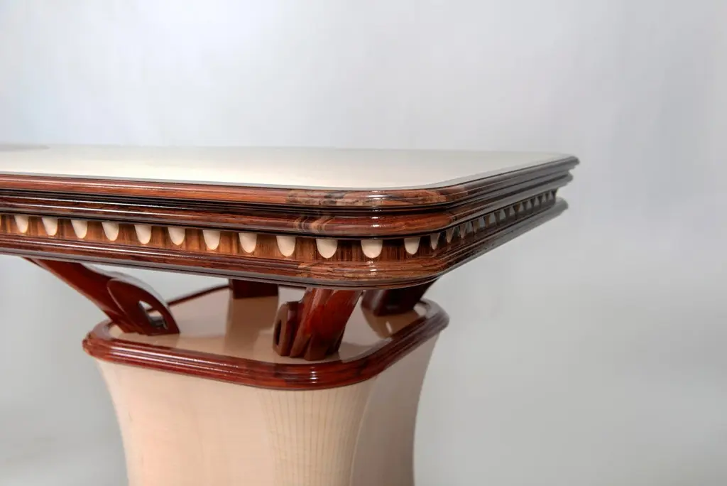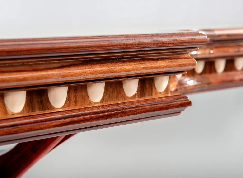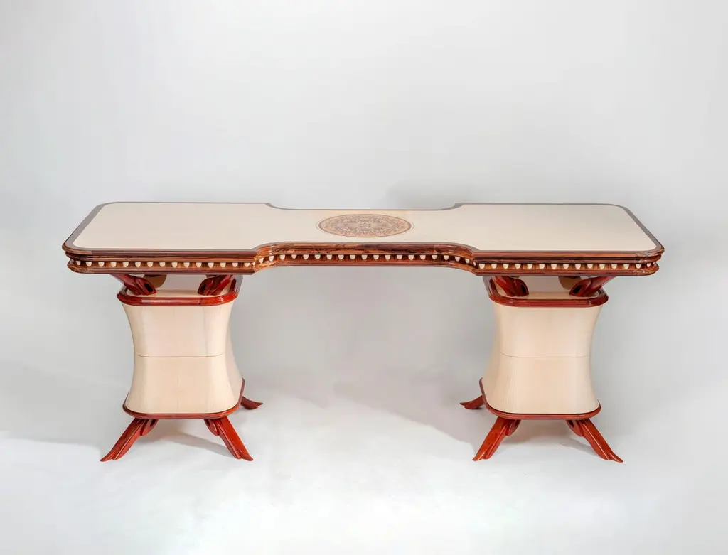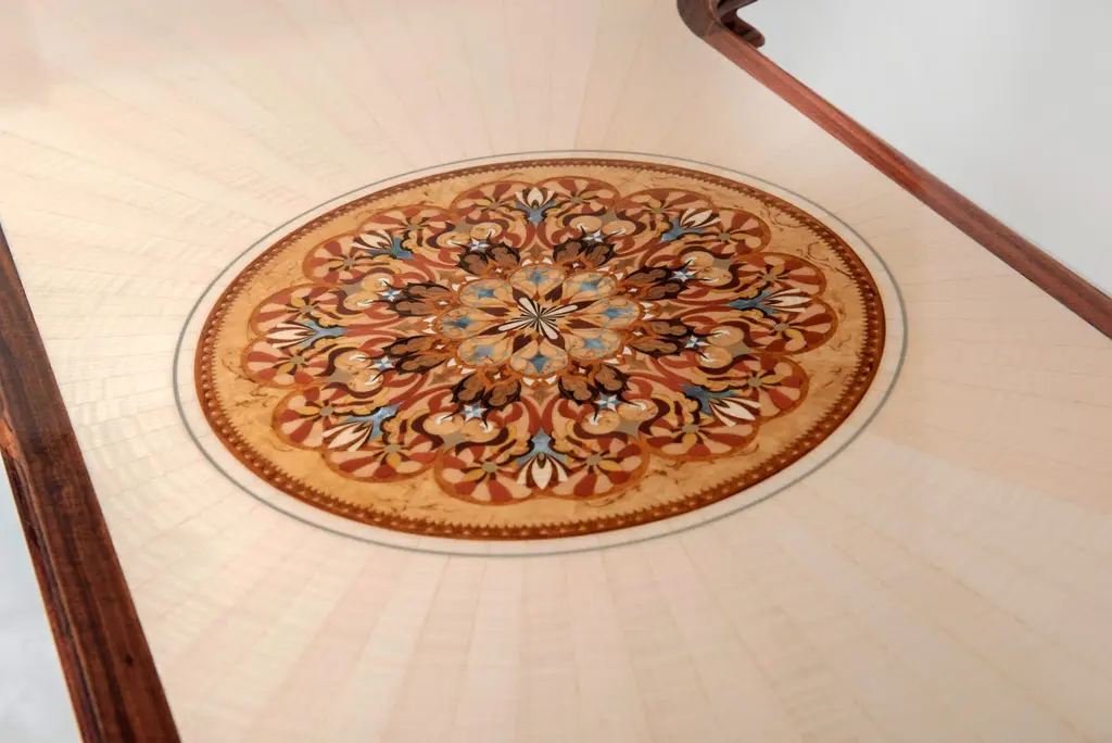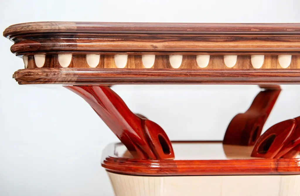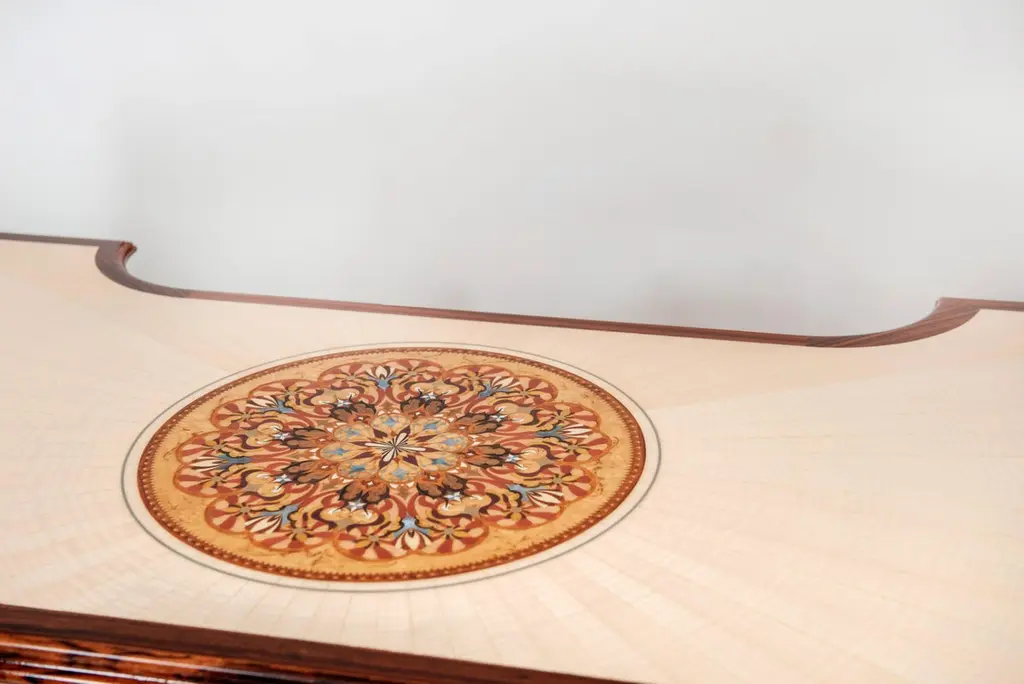 While designing Rhamtail desk, I was looking for experience. A feeling, a glorification, a comfort to sit in front of it. Thereby I imagined the uses, someone who continues clients conversations at his office. Thereby welcoming them inside and letting them be surprised by the interior object. Once seated, they can admire the tray up close. Once that conversation progresses they will see new details of the desk. This will create a reference of atmosphere during the conversation which the client takes home.The design of the top has a masculine character. Partly because of the profiled edge and thickness. Wherein the cones in the profile offers some grace. Which creates togetherness with the feminine cabinets underneath. With the concave cabinets, a slight profiling and the elegant legs. For the marquetry on the top, I design a mandala in my own style appropriate for the furniture. Where the symmetry and shapes provide enrichment. The focus is thereby drawn to the center.