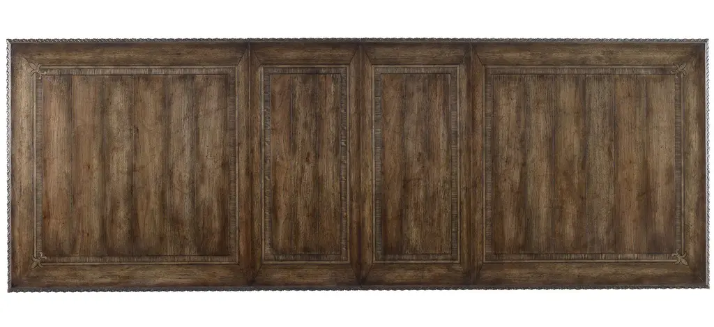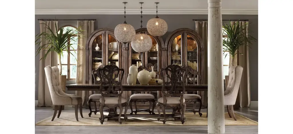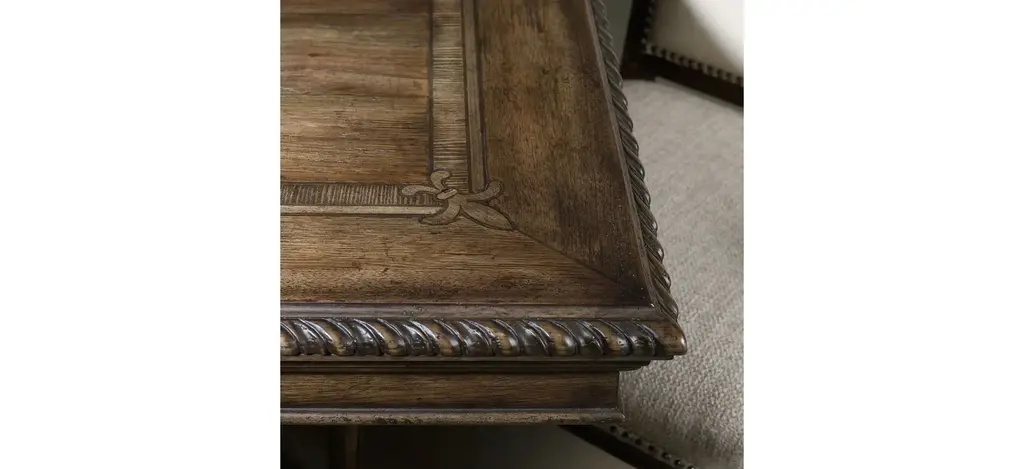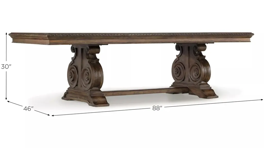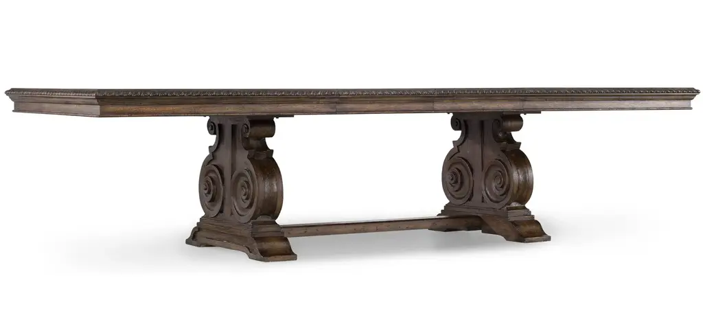 The drama of classic European design hits the heights with the grand Rhapsody Rectangular Dining Table with a scrolled trestle base. Imagine a 12th Century French chateaux that is been brought up to date without leaving a single charming detail behind. Choose to sit at the opulent yet inviting rectangular table with a carved border and scrolled bases in harp-like shapes. The walnut-colored reclaimed rustic finish projects laid-back luxury. At 88 inches long with two 20-inch leaves, this table can host a veritable banquet.